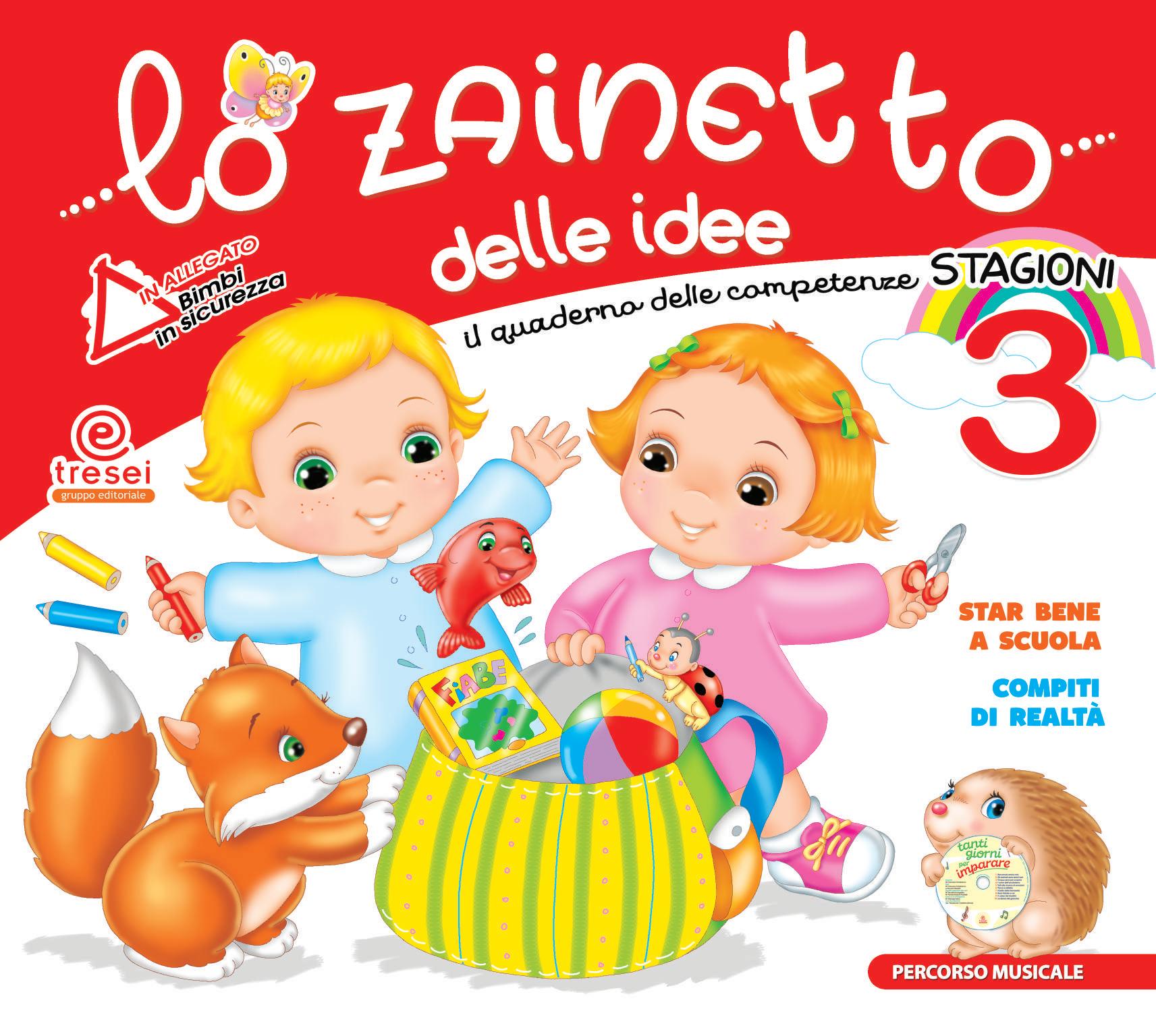 ll presente volume “Lo zainetto delle idee” si concentra sulle STAGIONI, che sono introdotte da quattro sim patici animaletti: il riccio, la volpe, la coccinella e il pesciolino, i quali contraddistinguono anche le pagine del quaderno, accompagnando i bambini in un coinvolgente percorso di scoperta. All’interno sono inoltre presenti i biglietti per le feste, con il diplomino di fine anno.