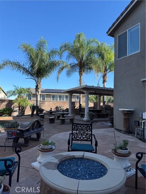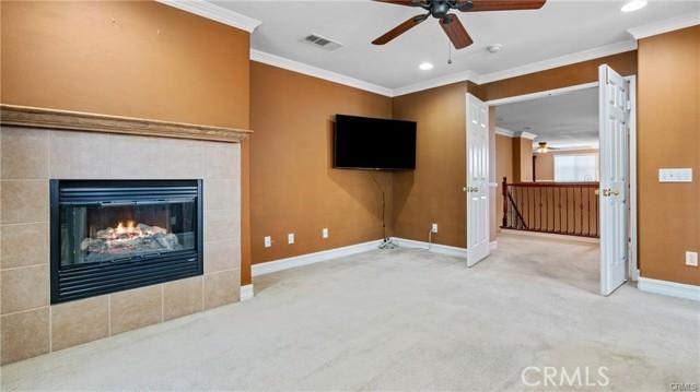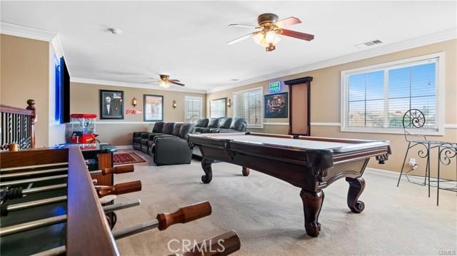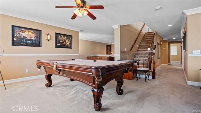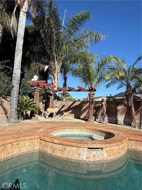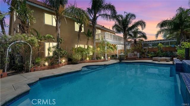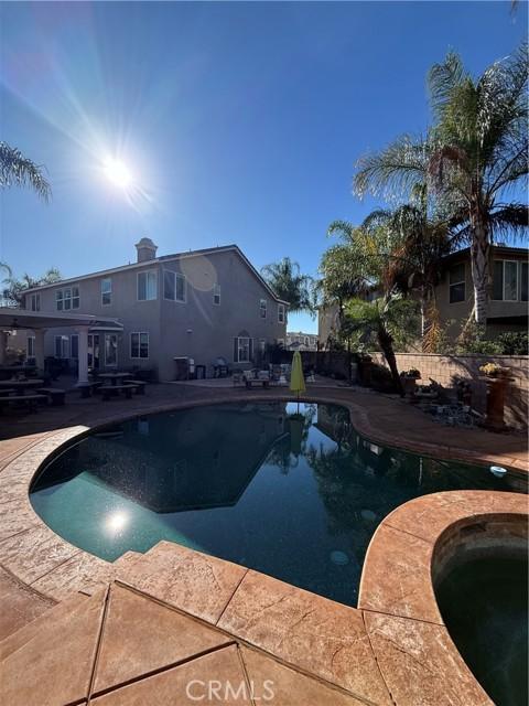 paradise tucked in a quiet, beautifully maintained community. This spacious three-story residence combines elegant finishes, resort-style amenities, and ample space for family living and entertaining. As you approach, youll be charmed by the homes impressive curb appeal, featuring a freshly manicured lawn, mature landscaping, and a wide driveway leading to a 3-car garage. A cozy front patio with a bench and lush potted plants provides a welcoming touch. Step inside through double entry doors into a grand foyer with soaring ceilings and elegant tile flooring. The expansive floor plan boasts a warm and inviting formal living room with crown molding, a gas fireplace, and gorgeous hardwood flooring. The formal dining area features classic chair rail detailing and large windows that flood the space with natural light, ideal for holiday gatherings and formal dinners. The chefs kitchen is a culinary masterpiece! With rich dark wood cabinetry, granite countertops, a large center island, built-in oven and microwave, and sleek black appliances, it offers both function and style. The adjacent dining nook and open layout make this kitchen perfect for casual family meals or weekend brunches. Relax in the ultimate upstairs game and media room, complete with plush theater seating, a billiards table, and a cozy fireplace. This versatile loft space offers endless possibilities for fun, lounging, or even converting into additional bedrooms or office space. Retreat to the spacious primary suite, where youll find serene views, neutral tones, and a spalike en-suite bathroom. The primary bath features a large dual-sink vanity, separate soaking tub and shower, and a walk-in closet with mirrored sliding doors. Step outside into your private tropical oasis! The stunning backyard showcases a sparkling swimming pool with built-in spa, surrounded by lush palm trees and vibrant landscaping. Entertain under a charming covered gazebo deck, dine al fresco on the patio, or unwind around the custom-built fire pit. Additional features include: Multiple living and entertaining areas, Large guest bathrooms with upgraded vanities, Indoor laundry room, Central A/C and heating, Security system in place, Meticulously maintained throughout. This one-of-a-kind property is the perfect blend of luxury, comfort, and resort-style living.