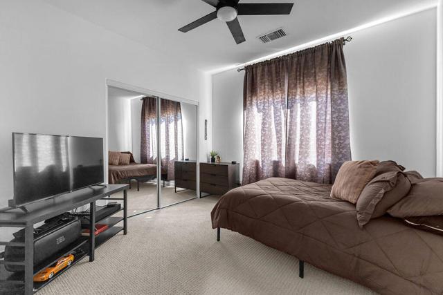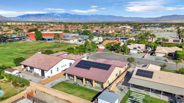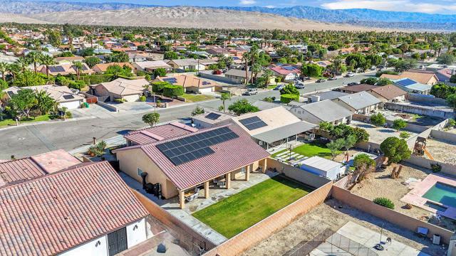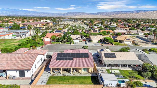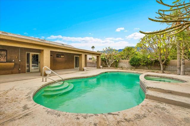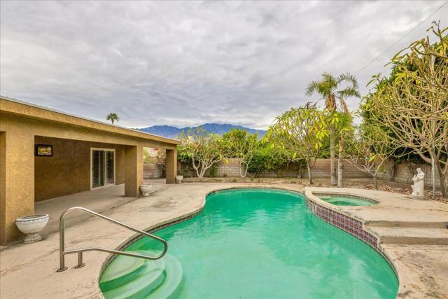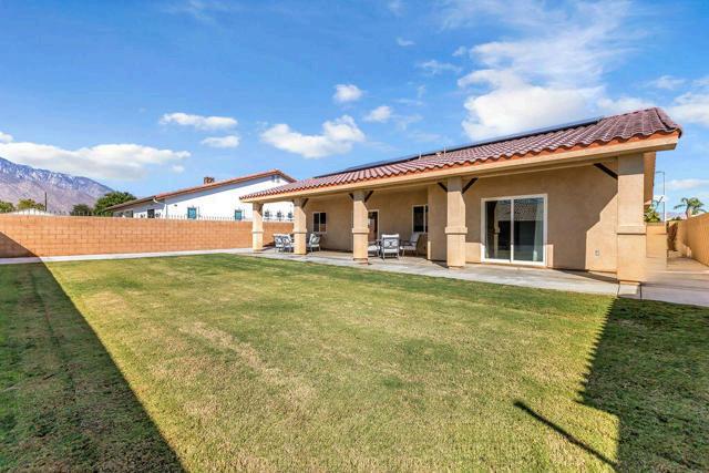 Discover this stunning 3-bedroom, 2-bath home with a den in beautiful Cathedral City, where breathtaking mountain views and modern comfort come together! Designed with an open-concept floor plan and high ceilings throughout, this home feels bright, spacious, and perfect for both relaxing and entertaining. The refurbished roof (just one year old) and leased solar panels add lasting value and energy savings. Step outside to your own private oasis. A sparkling pool and spa with a timed pool vacuum keeps everything pristine and ready for fun in the sun. Inside, enjoy the built-in surround sound system in the kitchen and family room, ideal for movie nights or gatherings. Both bathrooms feature double sinks, and one includes a private water closet with a pocket door for extra convenience. The attached 2-car garage offers built-in cabinets, shelving, and a workbench, providing plenty of space for storage or hobbies. Set in a quiet, friendly neighborhood, this home delivers the best of desert living style, comfort, and incredible views! (Note: Pool heater not working; fireplace painted but not fireproof.) Great location perfect for a family home or investment. Own your piece of Paradise today!