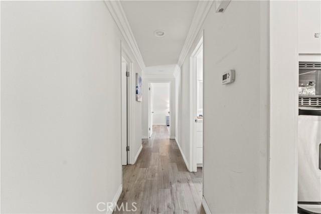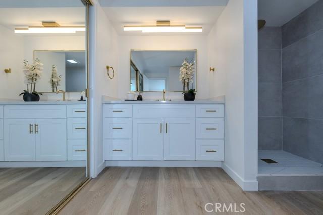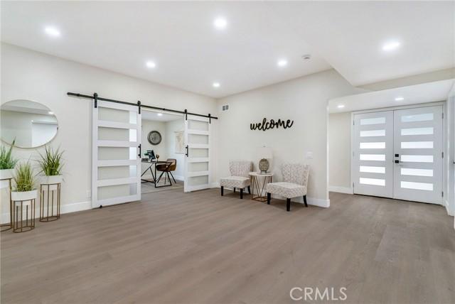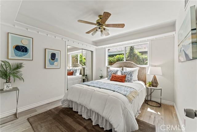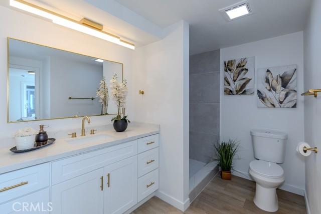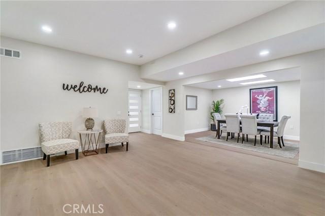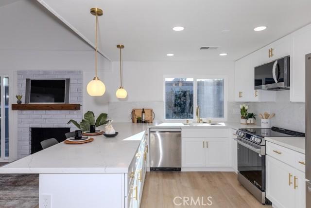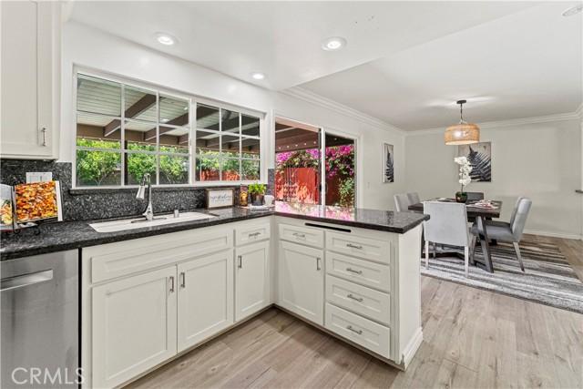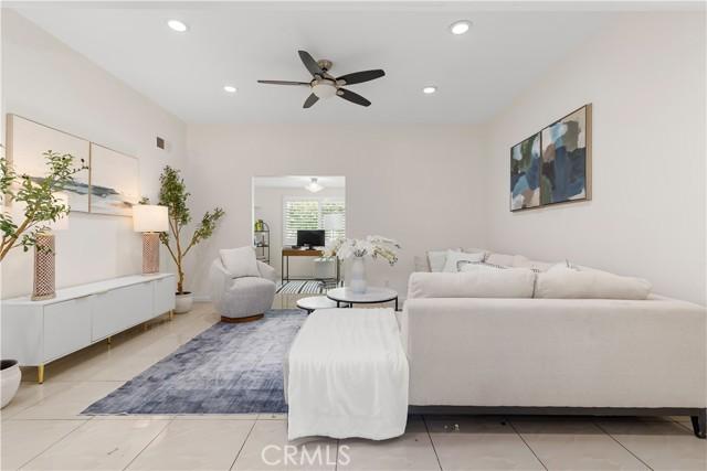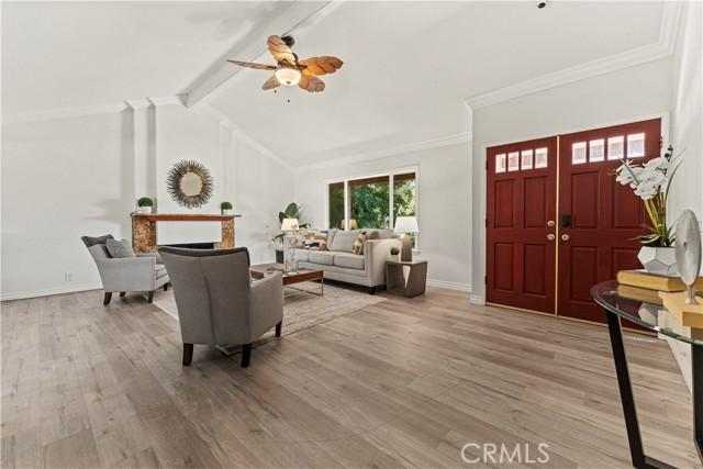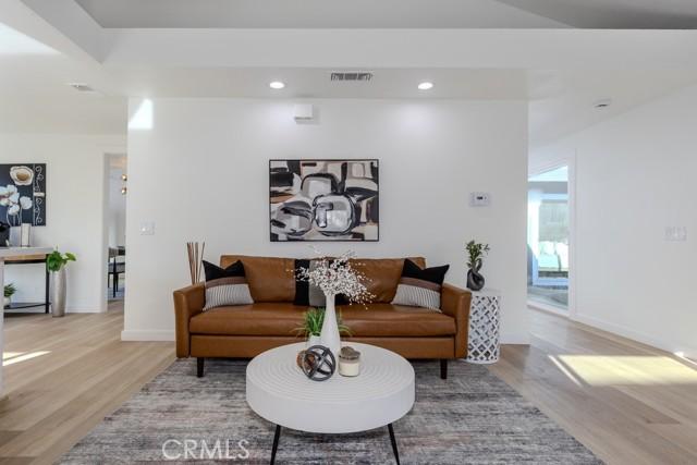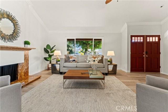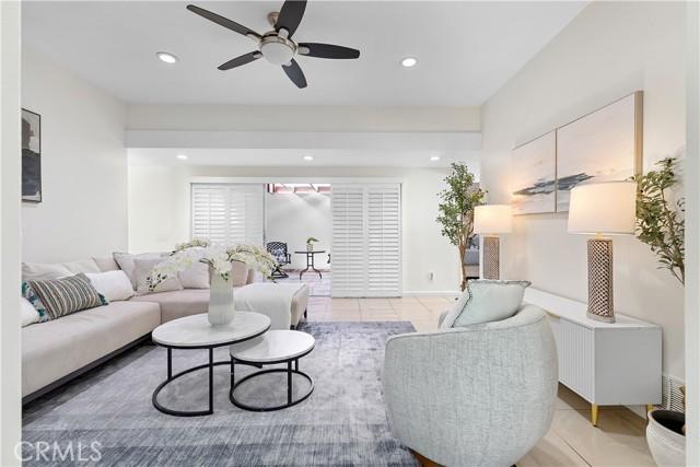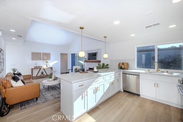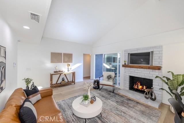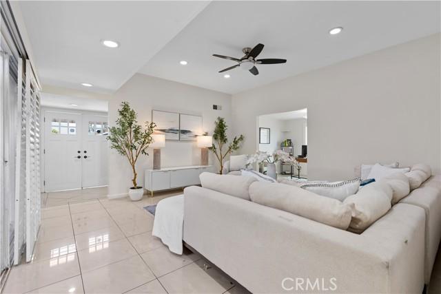 Single-story single-family home with fully renovated interior and modern finishes, located at 14452 Denbigh Lane, Tustin, CA 92780 in the Broadmoor Exclusives community. This Model 2 Custom Residence offers 3 bedrooms, 2 bathrooms, and 1,526 square feet of updated living space within a neighborhood of 128 homes built by Broadmoor. Entry begins through new double front doors into a defined landing with a closed coat closet. The living room is filled with natural light from a large sliding door opening to the atrium. The adjacent dining area connects seamlessly to the living space and includes recessed lighting. Continuing through the home, the family room features a fireplace with a wood mantel, recessed lighting, and open flow into the kitchen. The kitchen has been fully redone with quartz countertops, a matching quartz backsplash, shaker-style cabinetry, and a bar top seating area. Stainless steel appliances include an electric range, microwave, dishwasher, and refrigerator. A deep sink is paired with coordinated gold-tone fixtures and hardware carried consistently throughout the home. Recessed lighting and updated fixtures complete the space, while a side sliding door brings in additional natural light. The primary bedroom is set apart from the rest of the home for added privacy with no shared walls. It is positioned toward the front of the residence and offers dual closets, including one mirrored closet, along with a sliding door to the atrium. The en suite bathroom has been completely remodeled with quartz counters, new cabinetry, coordinated gold fixtures, and a walk-in shower with stone walls. Two additional bedrooms are located off the main hall, one with its own sliding door to the atrium. The guest bathroom includes quartz counters, updated cabinetry, matching gold fixtures, and a full bath with a stone surround. Renovations include permitted kitchen and bathroom remodels, new LVP wood flooring throughout, all new windows and sliding doors, new interior doors, updated electrical outlets and switches, fresh interior and exterior paint, and new exterior light fixtures. The backyard offers a private setting and serves as a blank canvas for future outdoor use. The property includes a two-car garage with direct interior access. Community amenities include a pool and a lounge area. Located within the Tustin Unified School District and close to shopping and restaurants, with convenient proximity to The District at Tustin Legacy and Old Town Tustin.