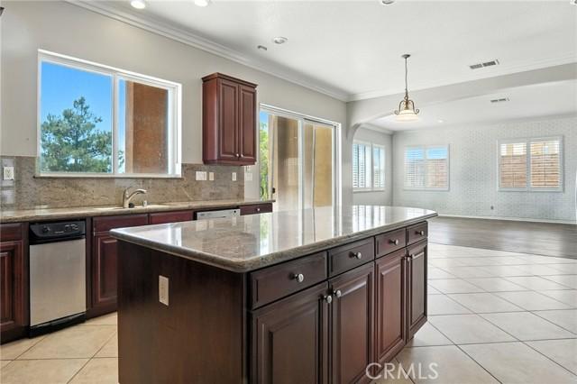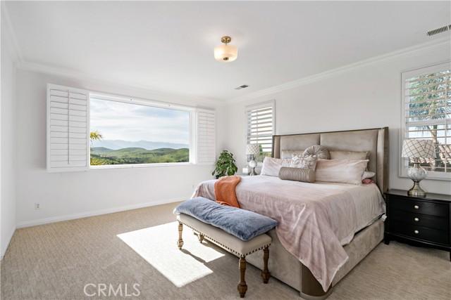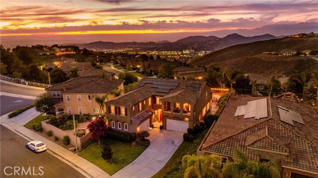 Perched on a quiet cul-de-sac in Lake Hills Reserve, this spacious, 4850 SqFt Executive Home offers the perfect blend of functionality, elegance, and energy efficiency complete with a whole house fan and FULLY OWNED SOLAR!! From the moment you step inside, youre greeted by soaring ceilings, an open entryway, and warm laminate wood flooring that leads to the formal living and dining areas. Thoughtfully designed for multigenerational living, the downstairs Jr. Suite features its own private bathroom -- ideal for guests or long-term stays. The kitchen features granite countertops, stainless steel everything including single basin sink, double ovens, a built-in microwave, vent hood, and a large island crowned with designer pendant lighting. A walk-in pantry and abundant cabinetry provide ample storage, while porcelain tile underfoot adds a sleek, durable finish. Upstairs, luxury vinyl plank flooring flows throughout. The primary suite offers a true retreat with a cozy fireplace sitting area, two walk-in closets, and two private balconies each with breathtaking panoramic views of the surrounding hills and views of the city skyline from the rear balcony! The en suite bath includes a jetted tub, walk-in shower, dual vanities, and a dedicated makeup area. Additional features include a spacious upstairs bonus room, generously sized secondary bedrooms including an additional Jr. Suite, designer lighting, ceiling fans, and a whole-house fan for year-round comfort. Out back, enjoy low-maintenance living with artificial turf, upgraded hardscape, and plenty of room to entertain. A long driveway leads to two separate garages with space for four vehicles -- perfect for car enthusiasts or large households. Situated on 750 acres, Lake Hills Reserve offers its residents an ideal mountaintop locale removed from city life, yet close to the many cultural and educational amenities of Riverside County and shopping. Residents enjoy the expansive open space, the HIGHLY rated Lake Hills Elementary and a private residents club including a swimming pool, playground, park and an open-air fireplace pavilion. This is an ideal location for commuters as the 91 Freeway and Metrolink are both close by. Are you ready for the Lake Hills Reserve lifestyle?