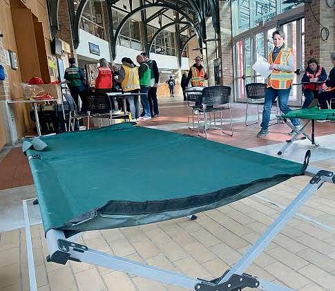 Left, cots are set up in the Galleria at Port Moody City Hall to accommodate overflow from a temporary shelter set up in the recreation complex during an earthquake preparedness exercise last Wednesday Above,Port Moody firefighter Jeff Scallion dispatches emergency services to locations on the map. MARIO BARTEL/TCN