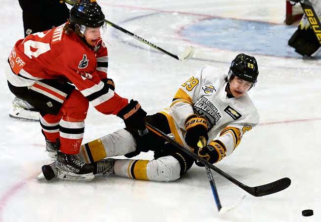 Coquitlam Express winger Emmett McHardy is dumped by Nanaimo Clippers forward Jake Hewitt as they battle for the puck in the first period of their BC Hockey League game, Sunday (Feb. 26) at the Poirier Sport and Leisure Complex. Nanaimo scored three times in the second period to win, 4–1 The result left the Express with a split of its weekend games after a 7–6 win over the Langley Rivermen last Friday (Feb. 24). The Express continued its quest to improve its seeding for the playoffs with a game against the Surrey Eagles Wednesday, after the Tri-City News’ print deadline. Heading into the game Coquitlam was in fourth place in the BCHL’s Coastal divsion, two points behind the Alberni Valley Bulldogs and two ahead of the Chilliwack Chiefs and Victoria Grizzlies.