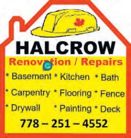 applianCe repairs APPLIANCEREPAIR •Fridge•Stove, •Washer•Dryer •Dishwasher•Microwave. Local.SameDayService. 604-999-7125 CeramiCtilinG BathroomRenovations TILING-AllInstallations Santo•778-235-1772 ConCrete NOJOBTOOsmall! ServingLowerMainland29Yrs! •Prepare•Form•Place•Finish •Granite/InterlockBlockWalls &Bricks•Driveways•Stairs •ExposedAggregate•Stamped Concrete•SodPlacement EXCRefs•WCBInsured 604-657-2375 604-462-8620 www.HerfortConcrete.ca •Driveway•Sidewalk•Patio •Patching&Repairs •Removal•Forms•Siteprep Bobcat&Excavator 604-813-6949 WedoALLkindsof ConcreteWork. •Seniorsdiscount. Local,familybusiness40+yrs 604-240-3408 DrainaGe DRAIN Tiles, Sewer,Water, VideoInspection, JackHammering, HandExcavating, ConcreteCutting, Rootering, WETBSMTMADEDRY 604.782.4322 DryWall Boarding&Taping, GoodRates!Reliable,Free Est.Reno’s&SmallJobs Welcome! CallGurprit 604-710-7769 eleCtriCal ACLASS ELECTRICIAN Res/comm.Fullylic.40 yrs.Localexp.Bonded, Ins,WCB.Greatrates.All workguaranteed2yrs. Freeest.7days8ammidnight.Smalltomid sizejobsandservicecalls. DAVE 778-230-0619 YOURELECTRICIAN Lic#89402.Insured.Guar’d. Fastsamedayservice. WeloveBIG&smalljobs! 604-568-1899 goldenleafelectrical.com AllElectrical,LowCost Licensed.Res/Com.Small jobexpert.Renos, Panelchanges. (604)374-0062 SimplyElectric exCavatinG #1Backhoes&Excavators TrenchlessWaterlines Bobcats&DumpTruck &AllMaterialDeliveries Drainage; VideoInspection, Landscaping, Concrete, Stump/Rock/Cement/Oil Tank&Demos, Paving, Pool/DirtRemoval,Paver Stones,Jackhammer, Water/Sewer,Line/Sumps, SlingerAvail,ConcreteCutting,HandExcavating. BasementsMadeDry Claudio’sBackhoeService 604-341-4446 AllBobcat& Mini-XService •SmallHauls~ Pickup/Delivery LawnRemoval& ChaferBeetleSolutions! •Concrete&Asphalt Ryan 604-329-7792 exCavatinG PEDRO’S Contracting&Drainage •Landscaping •WaterLines •CementWork •ChimneyRepair&More 604-468-2919 floorinG HardwoodFloor RefinishingExperts •Repairs•Staining •Installation • FreeEstimates 604-376-7224 centuryhardwood.com Gutters •GutterCleaning •RoofCleaning •PowerWashing WorkSafeBC•Insured www.gutterguys.ca Mike604-961-1280 M.T.GUTTERS ProfessionalInstallation 5”Gutter,DownPipe,Soffit 30YEARSEXPERIENCE ~ FULLYINSURED ~ CallTim 604-612-5388 CHAMPIONPROPERTY SERVICESINC 0.75000X1 R0021897916::#727692 GUTTERS CallSimonforprompt& professionalservice30yrsexp. GutterCleaning,PowerWashing, WindowCleaning,RoofCleaning 604-230-0627 HanDyperson SmallRenos. +Decks, Fence&StairRepairs IfICan’tDoIt, ItCan’tBeDone! 604-941-1618 CallRobert 604-844-4222 lanDsCapinG Start-Finish.Demo-Design. PAVERS Driveway,Sidewalk ConcreteRemoval-Replace LANDSCAPING,Turf,Hedges RetainingWall,Patio.Drainage 604-782-4322 COMMUNITY MARKETPLACE classifieds.tricitynews.com Calloremailtoreserveyourspace, MondaythroughFriday8:30amto4:30pm: 604-362-0586•604-653-7851 DTJames@glaciermedia.ca•nmather@glaciermedia.ca Orbookyouradonline24/7: tricitynews.adperfect.com ADVERTISINGPOLICIES Alladvertisingpublishedinthisnewspaperis acceptedonthepremisethatthemerchandise andservicesofferedareaccuratelydescribed andwillinglysoldtobuyersattheadvertised prices.Advertisersareawareofthese conditions.Advertisingthatdoesnotconform tothesestandardsorthatisdeceptiveor misleading,isneverknowinglyaccepted.Ifany readerencountersnon-compliancewiththese standardsweaskthatyouinformthePublisher ofthisnewspaperandTheAdvertising StandardsCouncilofB.C. OMISSIONAND ERROR: Thepublishersdonotguaranteethe insertionofaparticularadvertisementona specifieddate,oratall,althougheveryeffortwill bemadetomeetthewishesoftheadvertisers. Further,thepublishersdonotacceptliability foranylossofdamagecausedbyanerroror inaccuracyintheprintingofanadvertisement beyondtheamountpaidforthespaceactually occupiedbytheportionoftheadvertisement inwhichtheerroroccurred.Anycorrections of changeswillbemadeinthenextavailable issue. TheTri-CityNewswillberesponsible foronlyoneincorrectinsertionwithliability limitedtothatportionoftheadvertisement affectedbytheerror.Requestforadjustments orcorrectionsonchargesmustbemade within30daysofthead’sexpiration. Forbestresultspleasecheckyouradfor accuracythe firstdayitappears.Refunds madeonlyafter7businessdaysnotice! TODAY'SPUZZLEANSWERS FindBIGSavings... WhenYouPlaceYourAd intheClassifieds! A46 TRICITYNEWS.COM THURSDAY,SEPTEMBER22,2022
