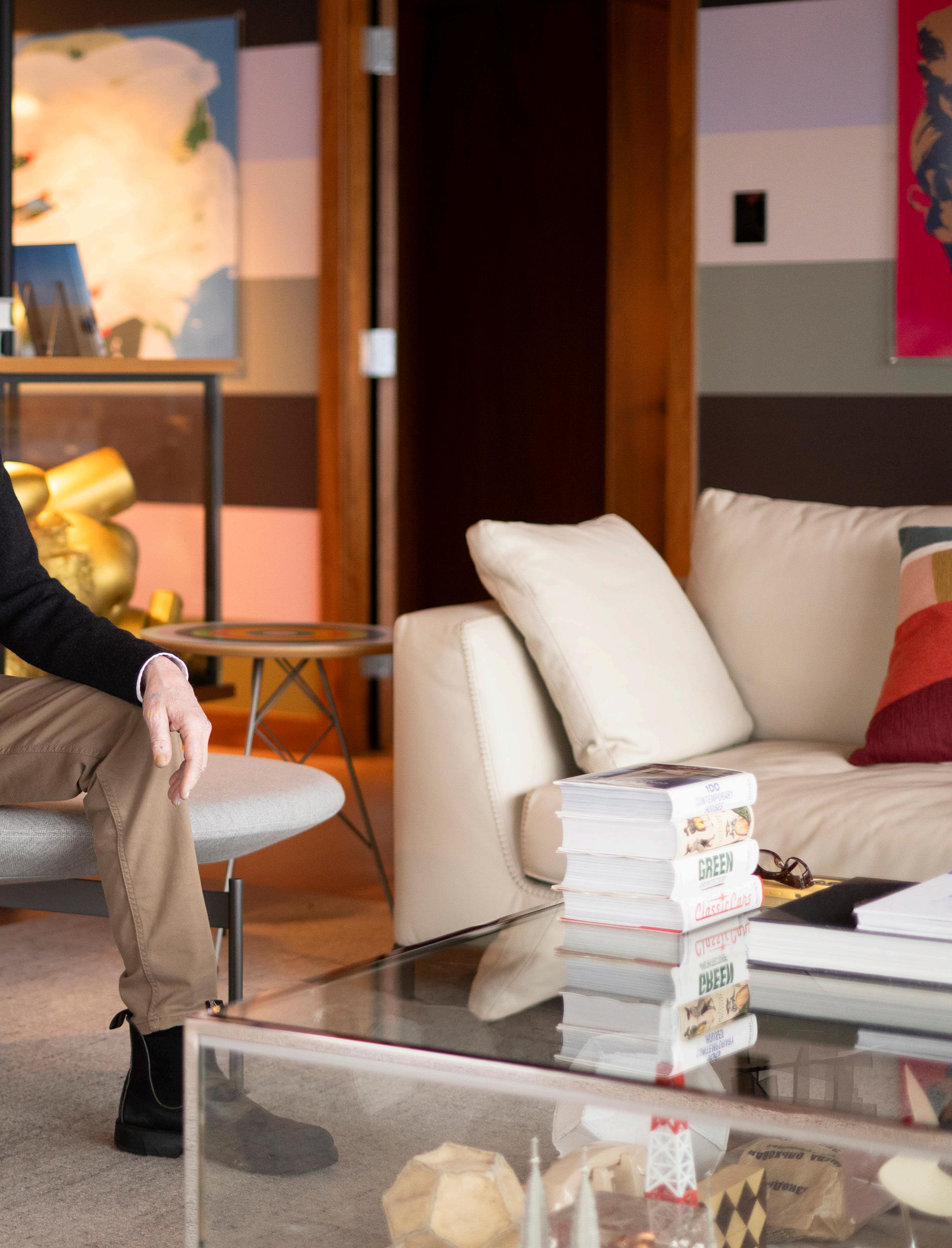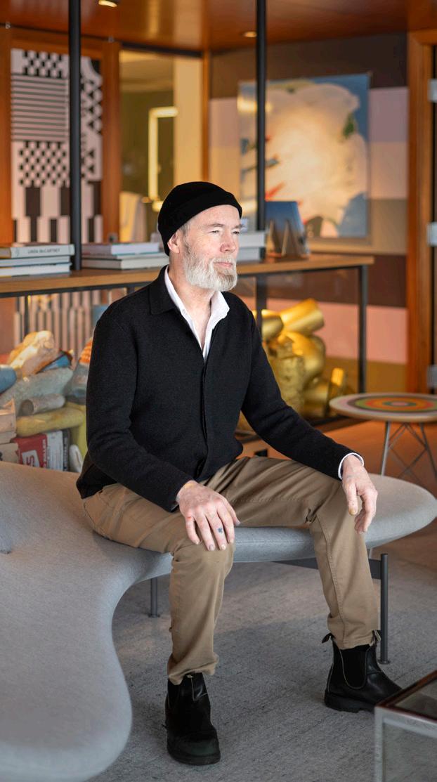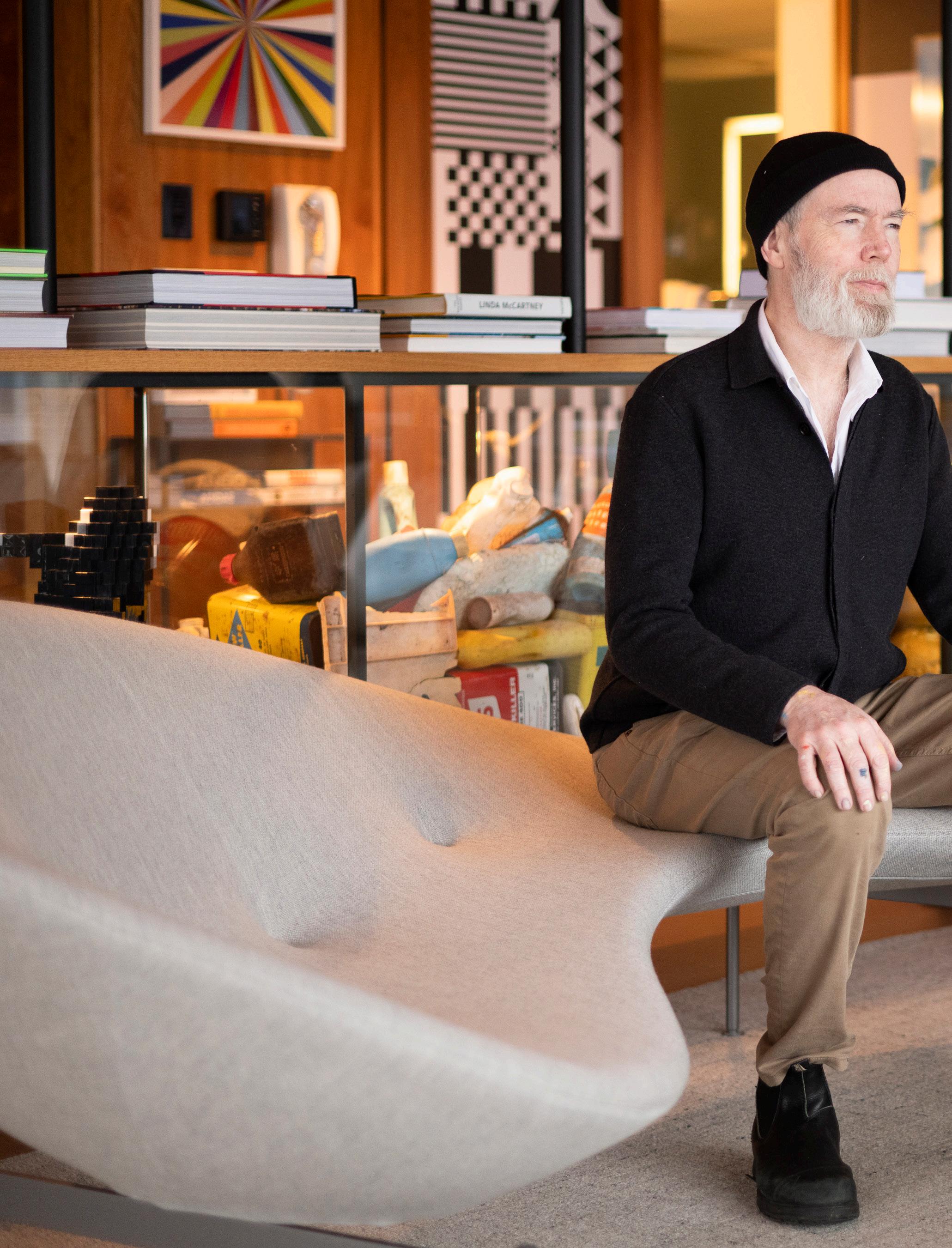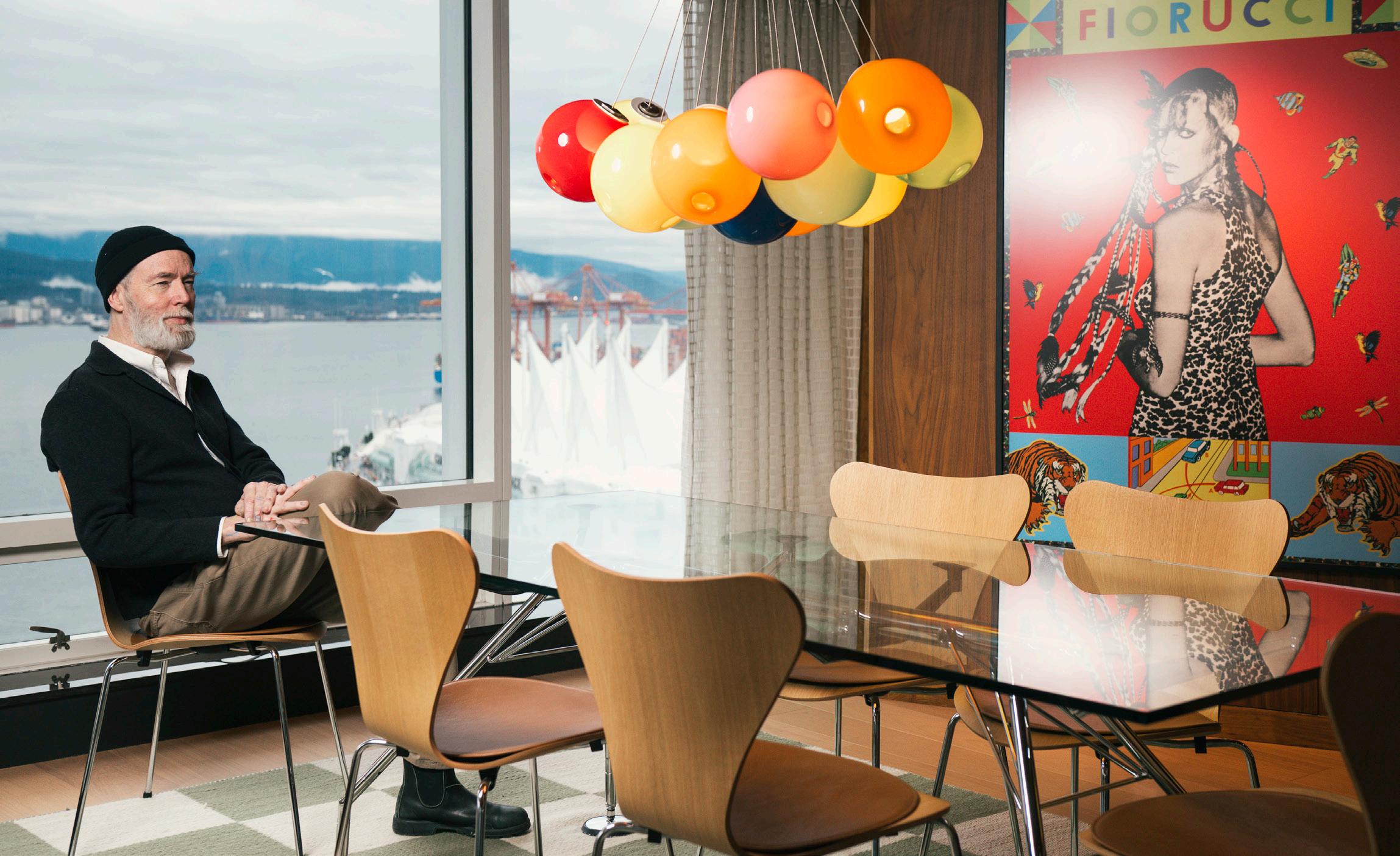 Only a carpet, TV and a couple of couches were picked without Coupland. The rest comes from his brain. “I think everything else here was by me or things I recommended. I will say that the chairs and tables there are exactly like the ones in my dining room,” he says, gesturing to the glass dining room table with a paintflecked hand.