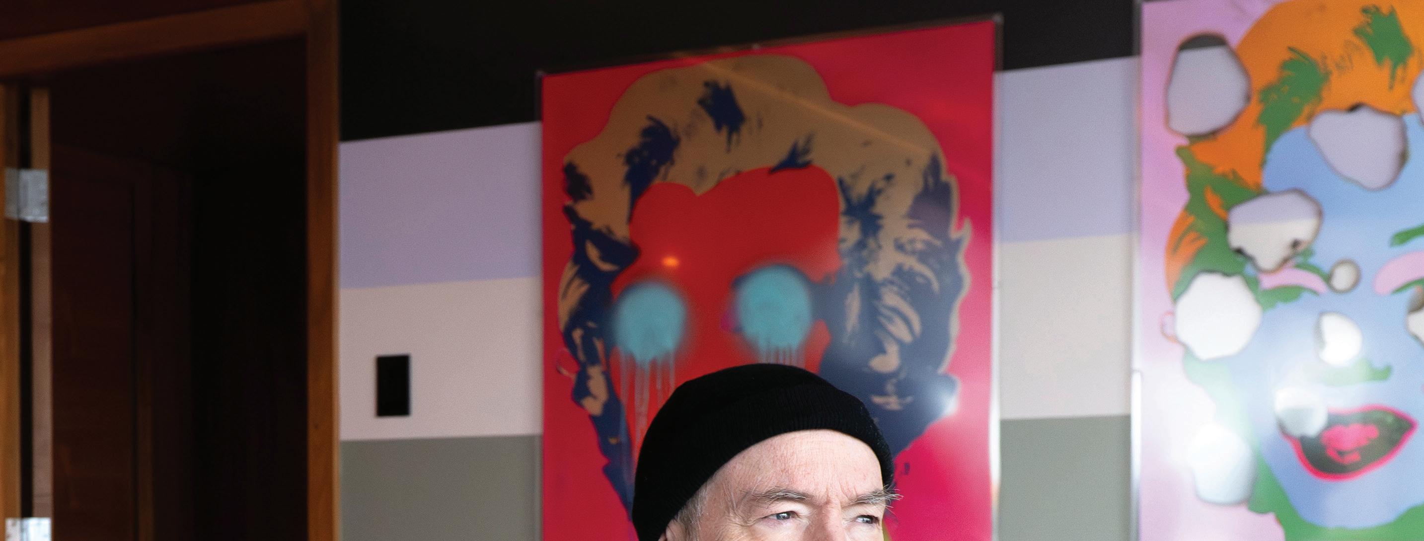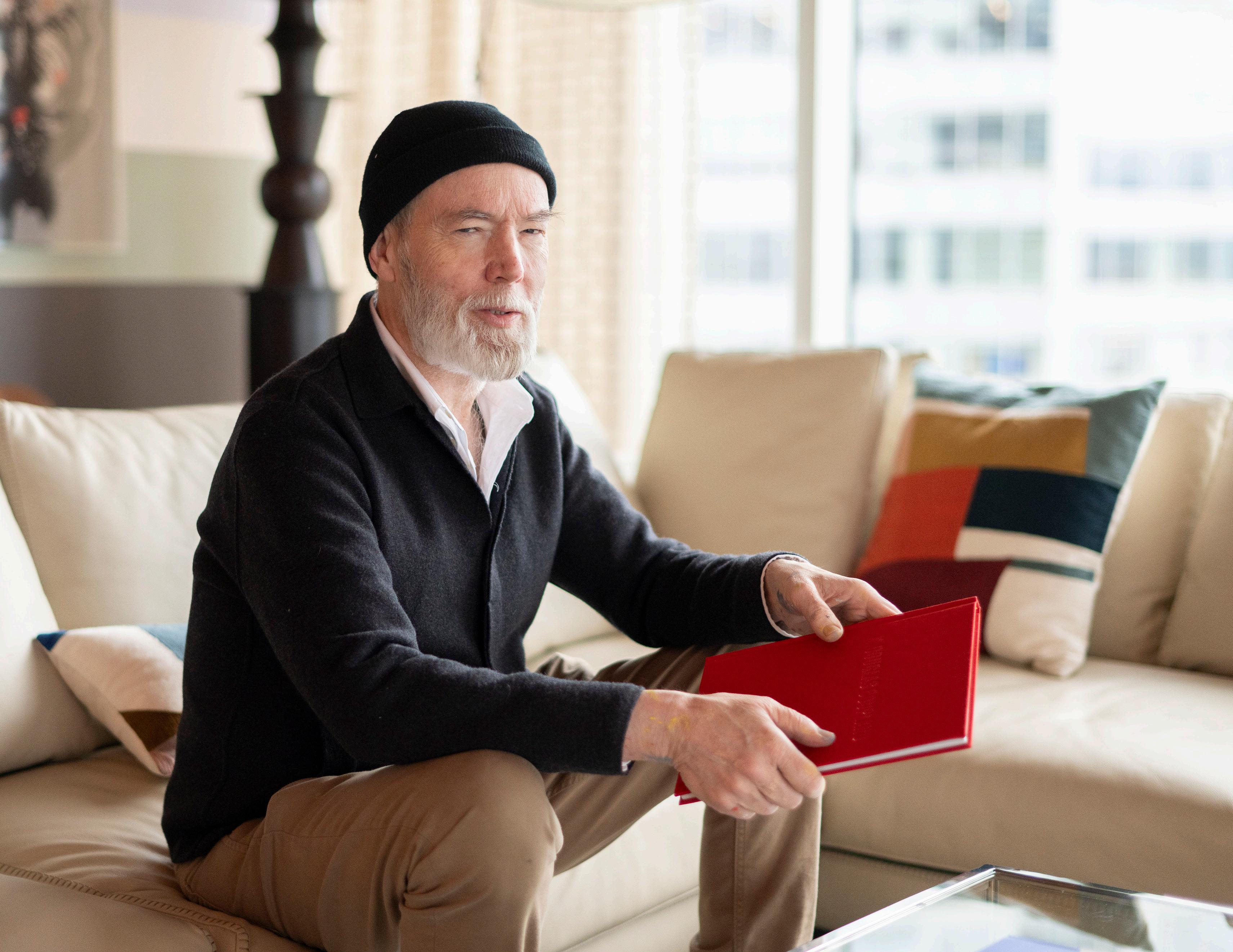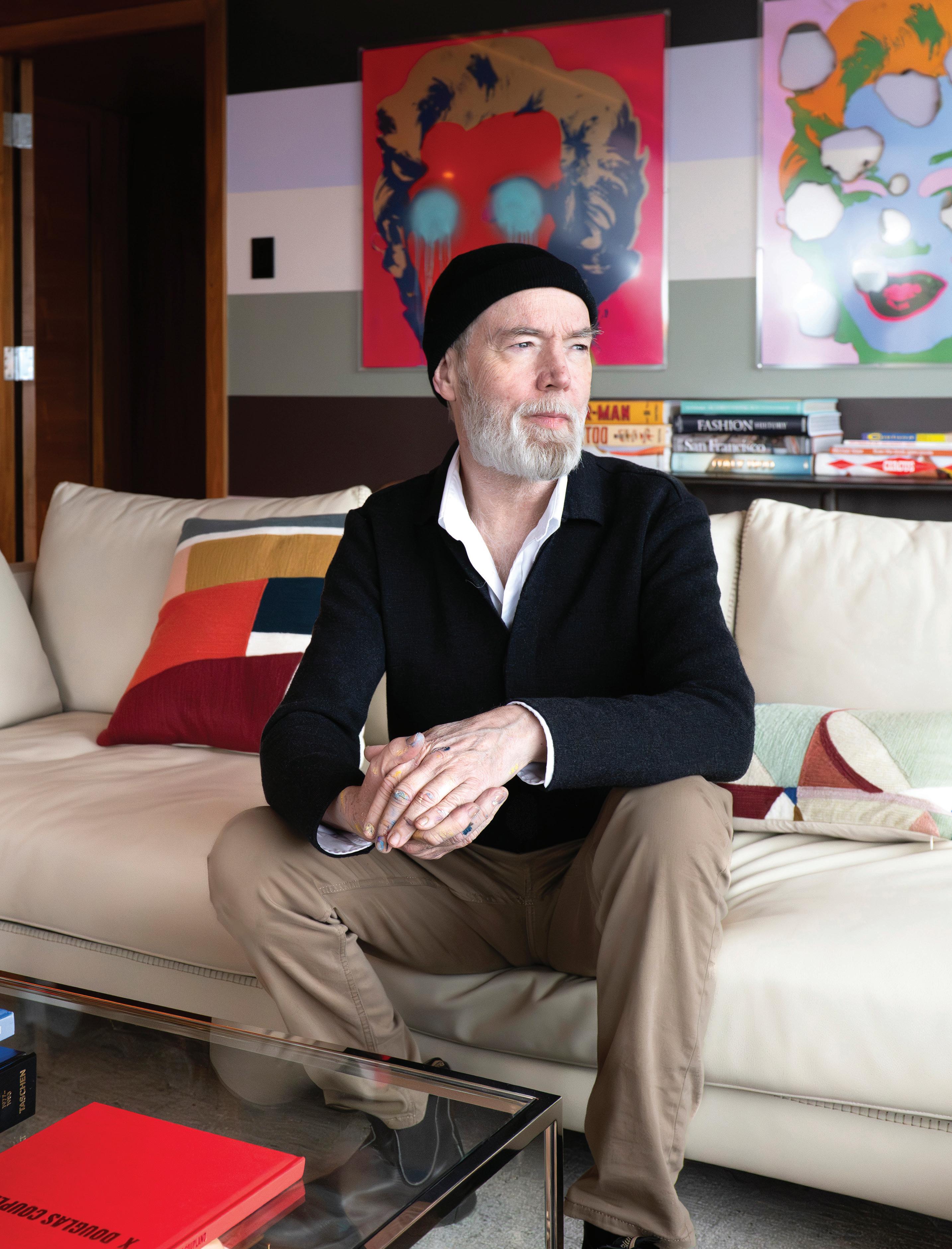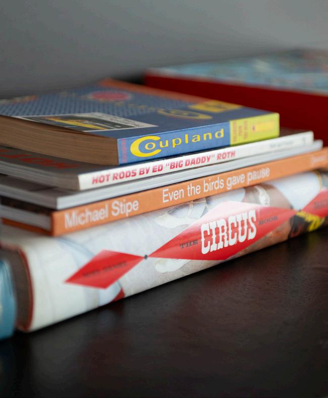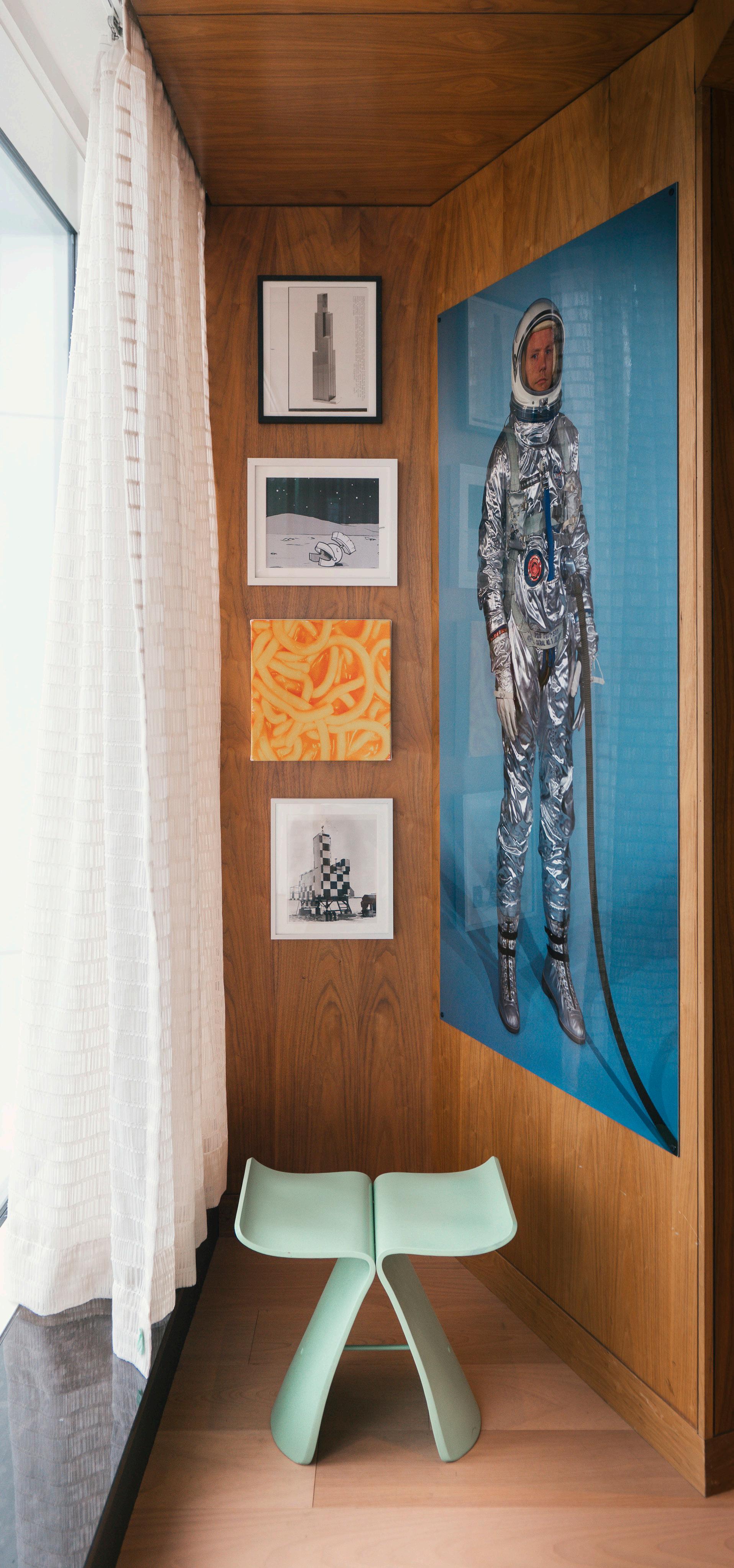 Only a carpet, TV and a couple of couches were picked without Coupland. The rest comes from his brain. “I think everything else here was by me or things I recommended. I will say that the chairs and tables there are exactly like the ones in my dining room,” he says, gesturing to the glass dining room table with a paintflecked hand.