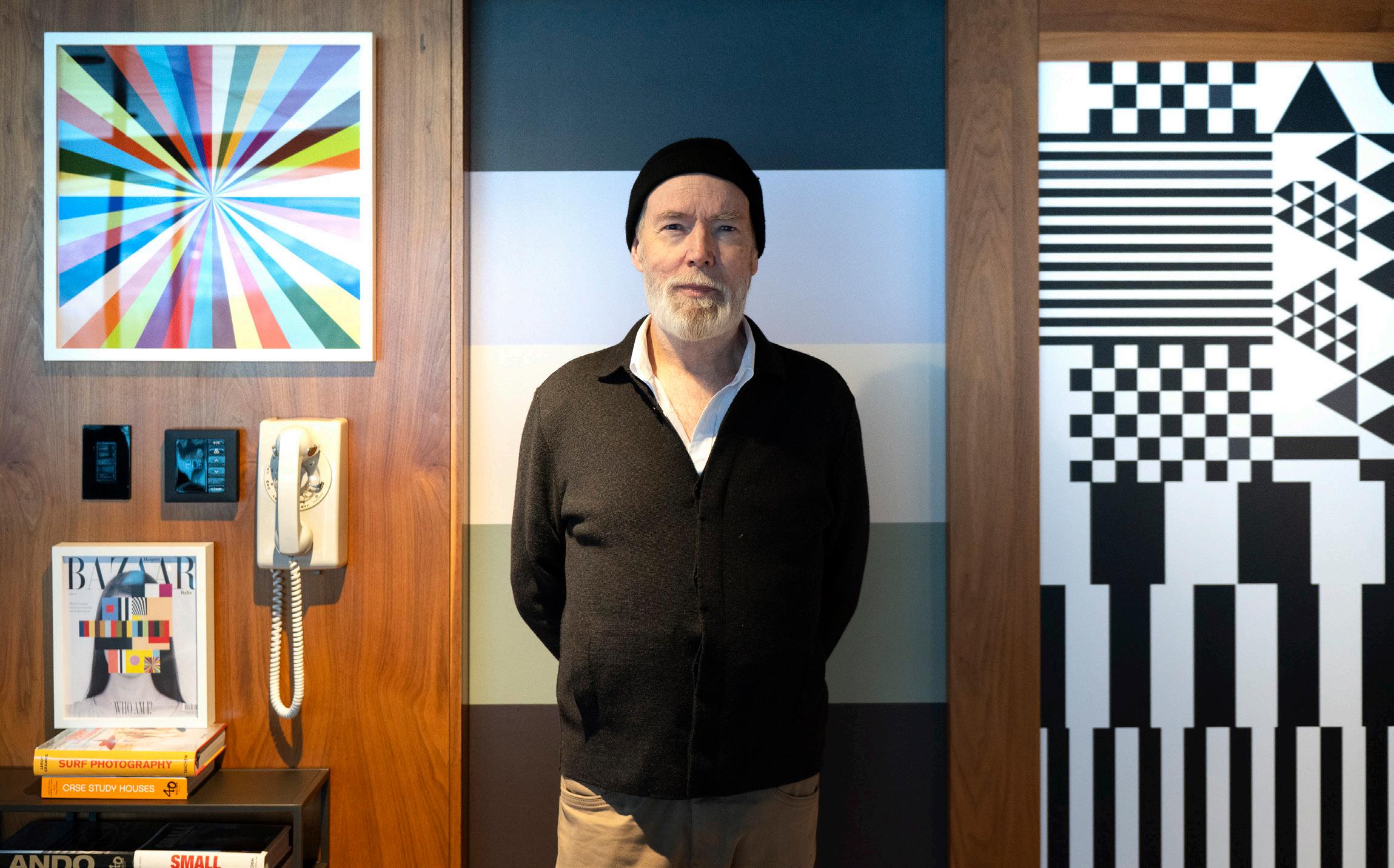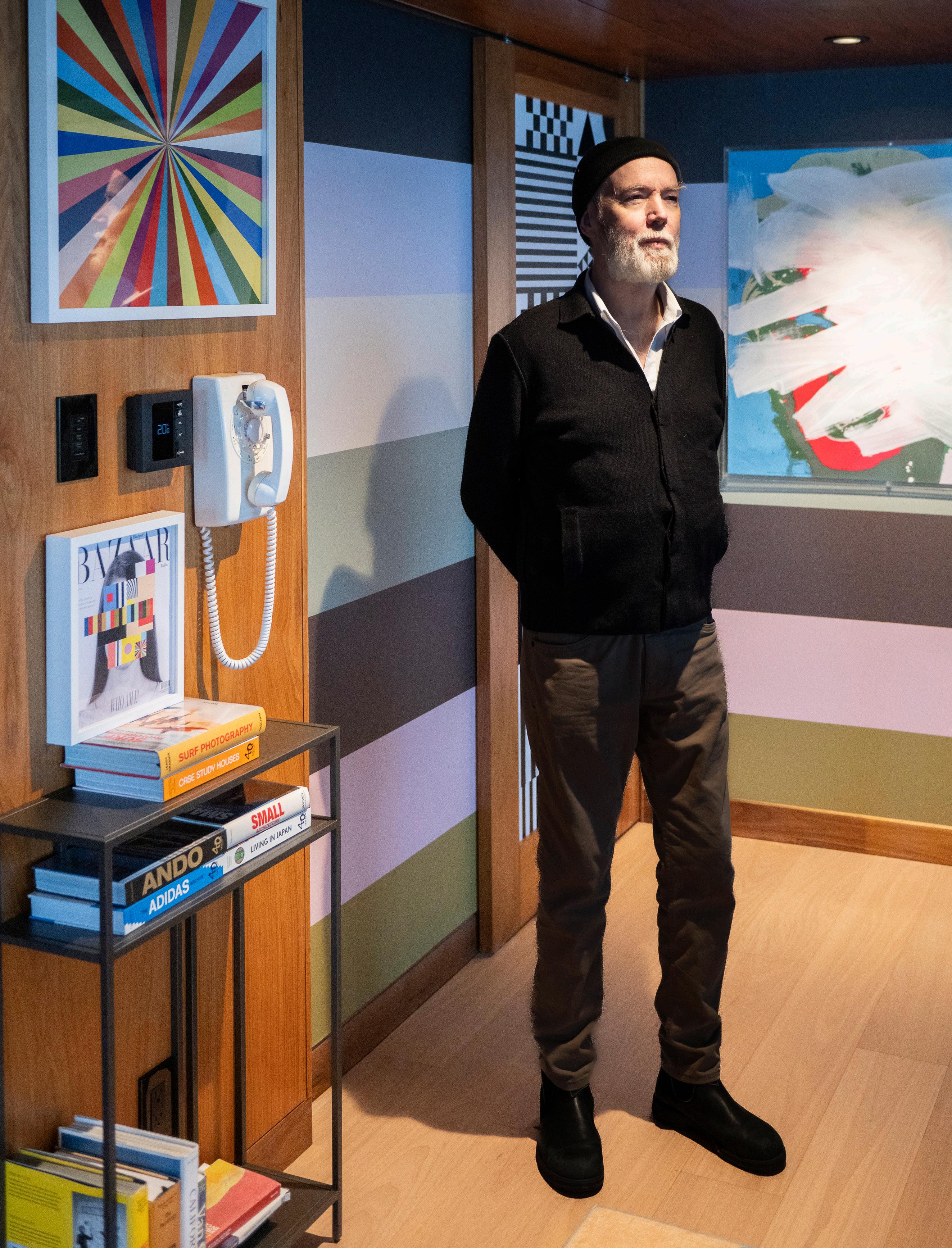 “Like, this should be….” He pauses, getting up to move a small table a few inches from the wall. “There. Like this.” It needs breathing room around it, so it can “work as an object instead of melting into a generic pillar,” he explains, referring to a column in the wall behind the table. “I’m less of a control freak than I used to be, but that’s where it goes,” he says. “And see, it doesn’t make any difference from anyone else’s point of view.”
