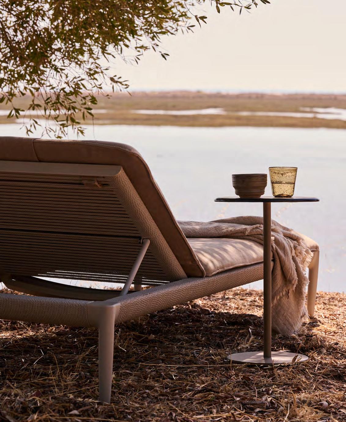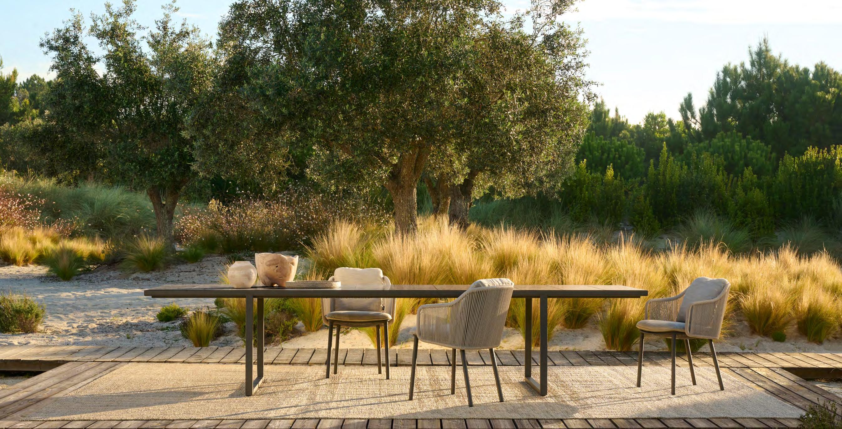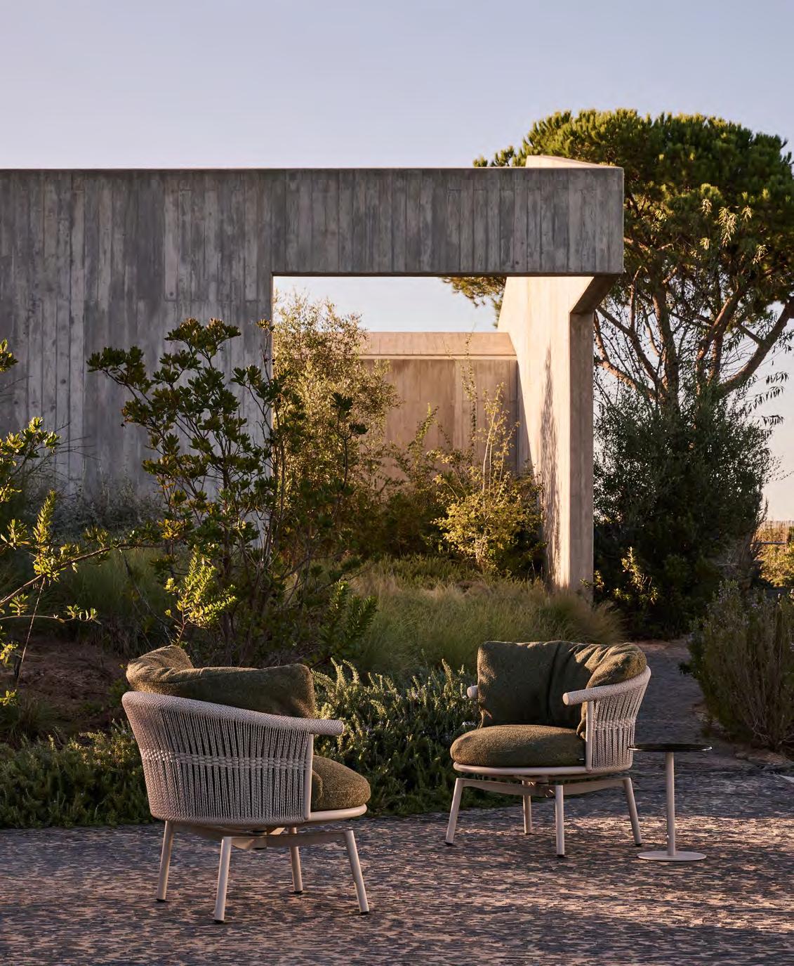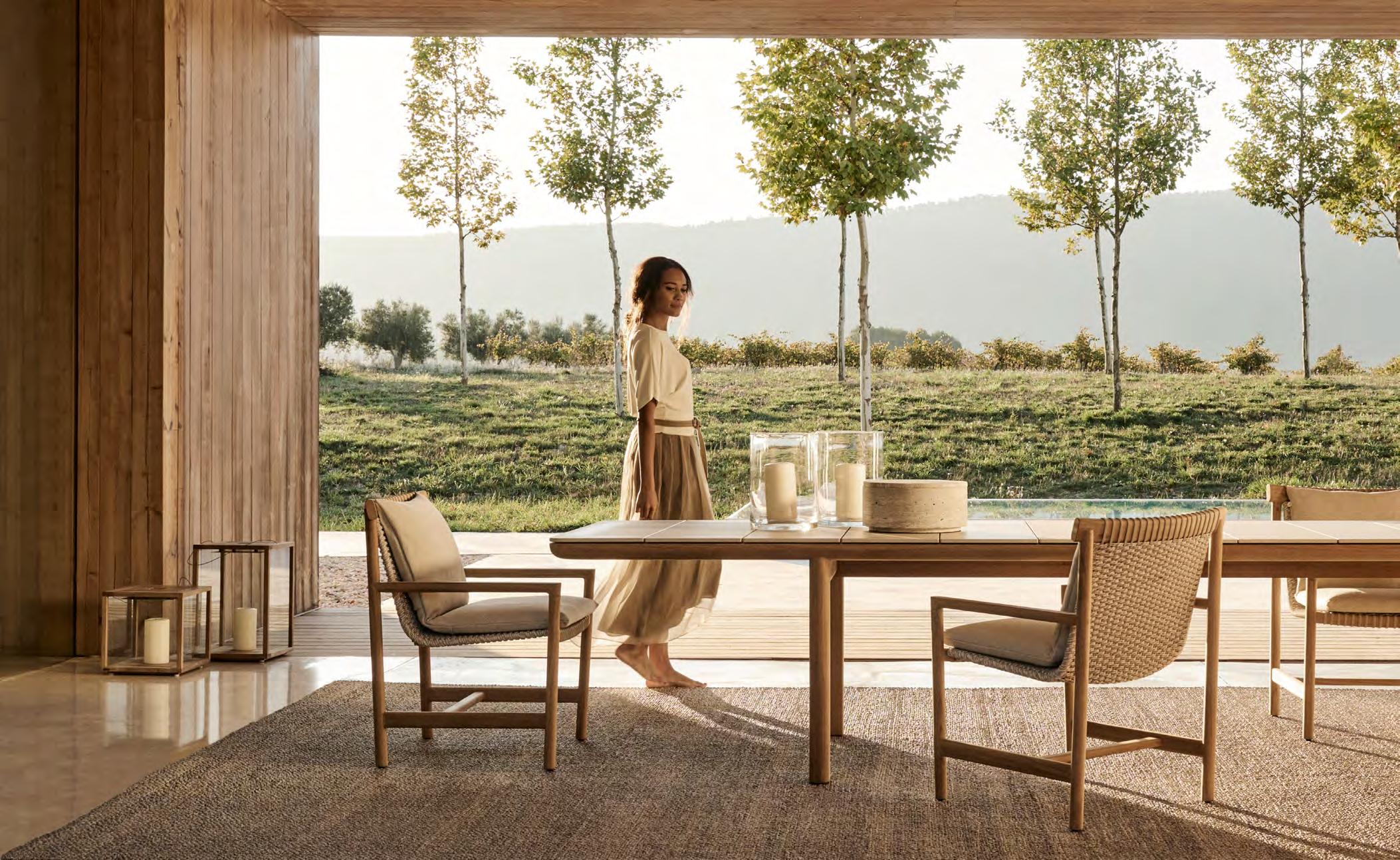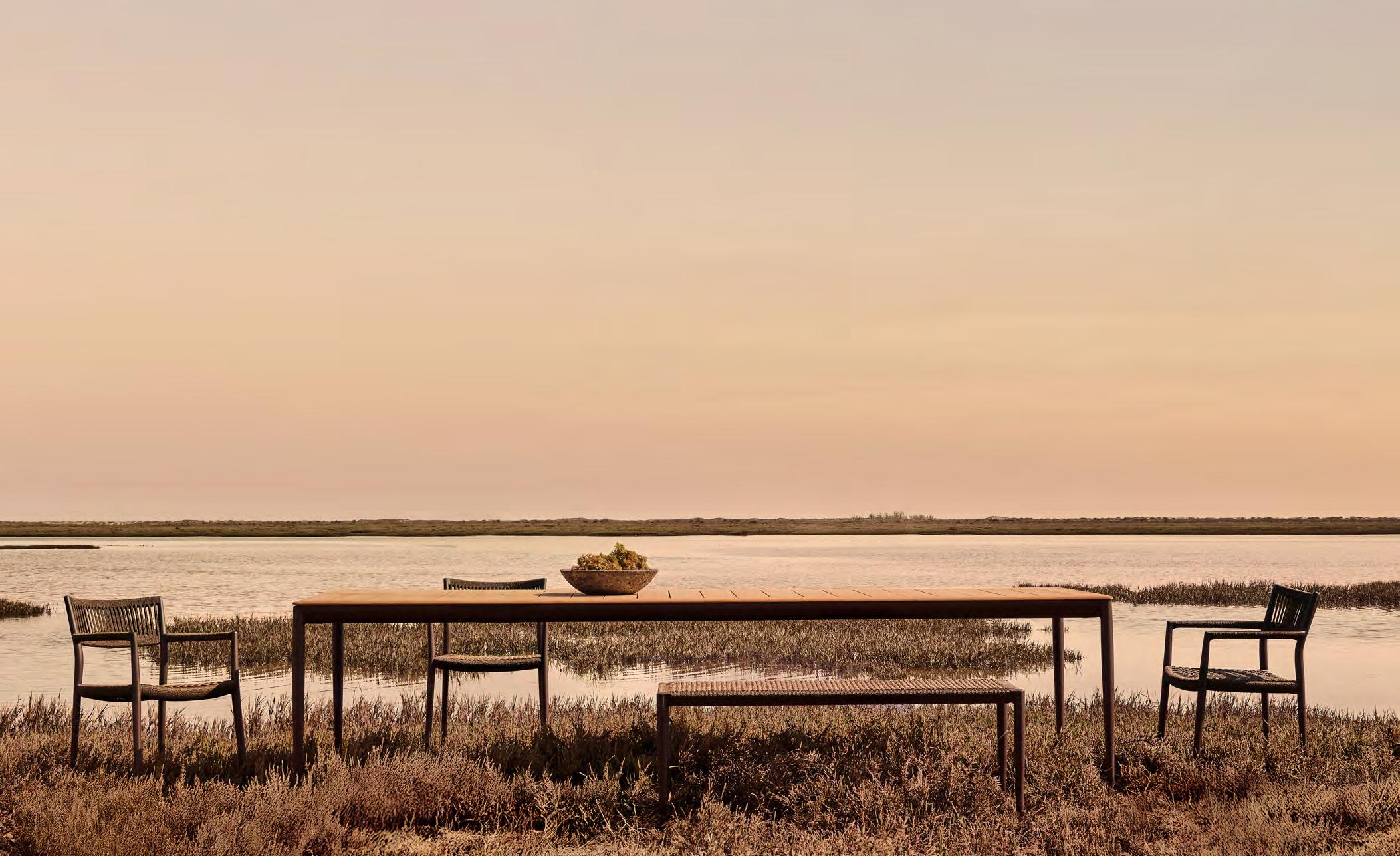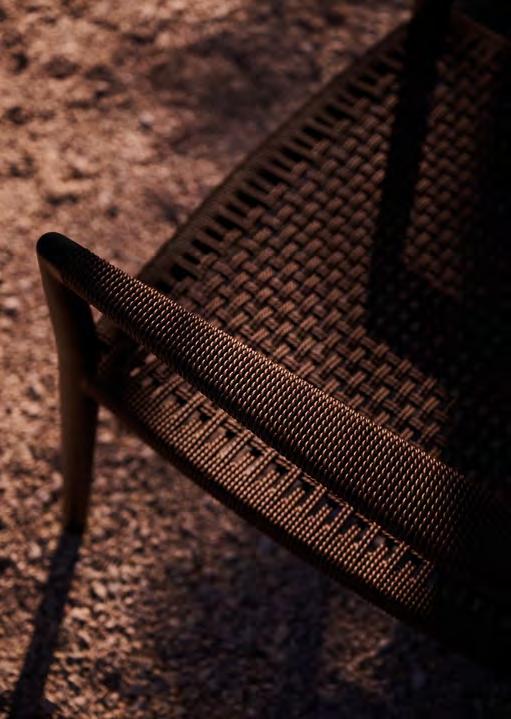 gently flowing lines and ultra-light cast aluminium frame create a serene, understated presence. Handwoven Canax® detailing adds natural texture and lasting comfort, with finishes in linen aluminium with linen weave or dark bronze aluminium with copper weave. Designed for both dining and lounging, the collection includes an armchair, lounge chair, bench, dining tables with teak or ceramic tops on aluminium frames, and a lounger available with fixed legs, wheels, or stackable legs with wheels. Nagomi integrates effortlessly into any setting, offering spaces of quiet refinement.