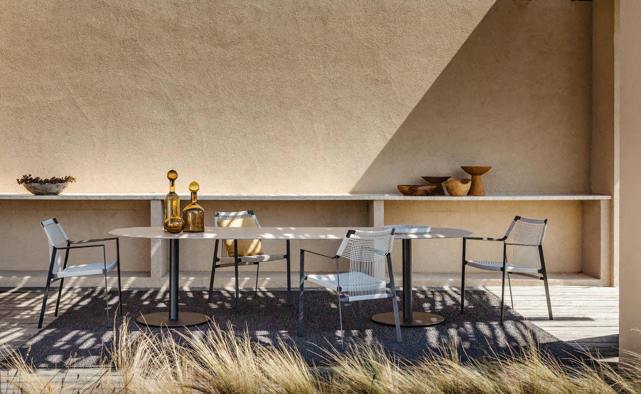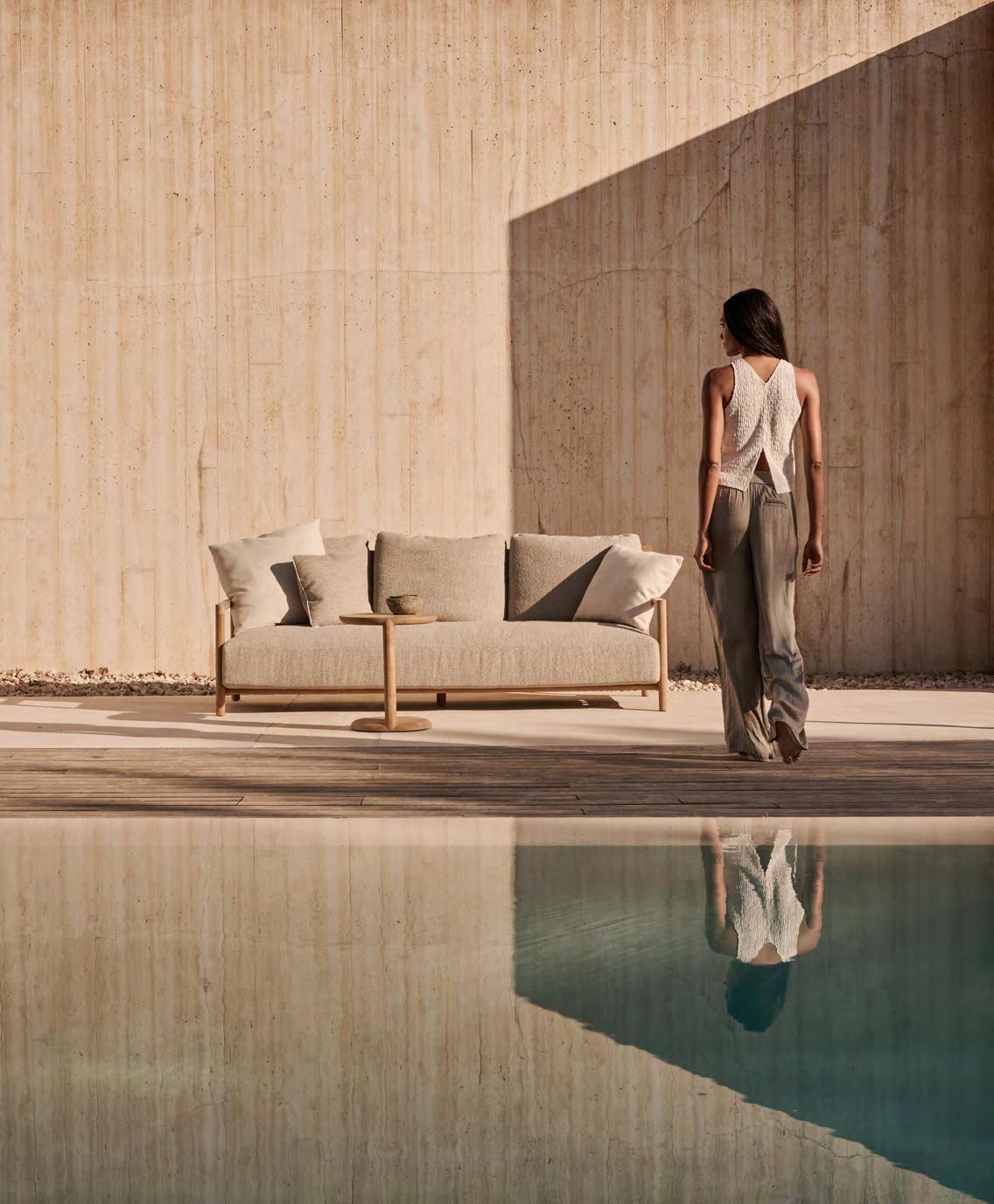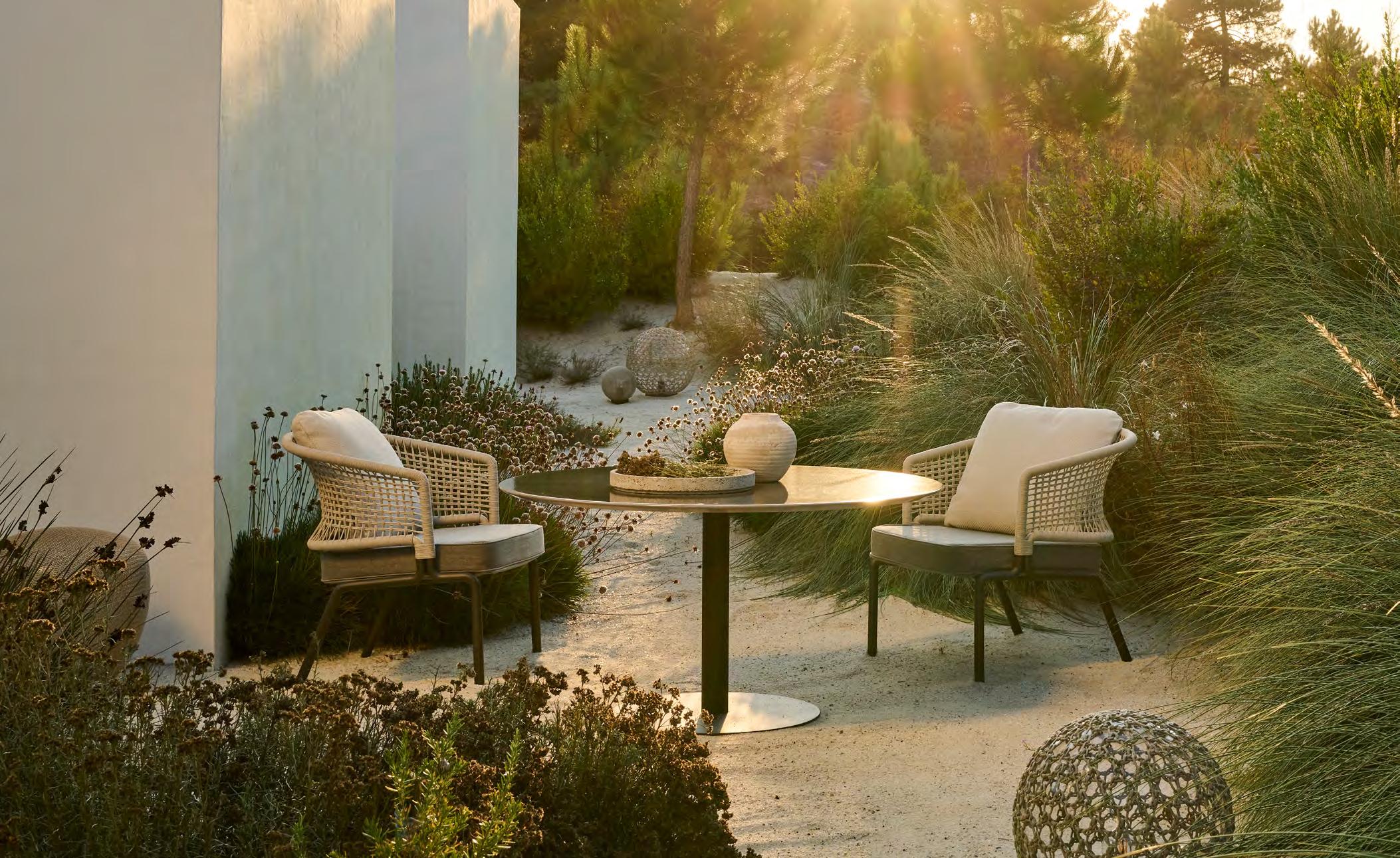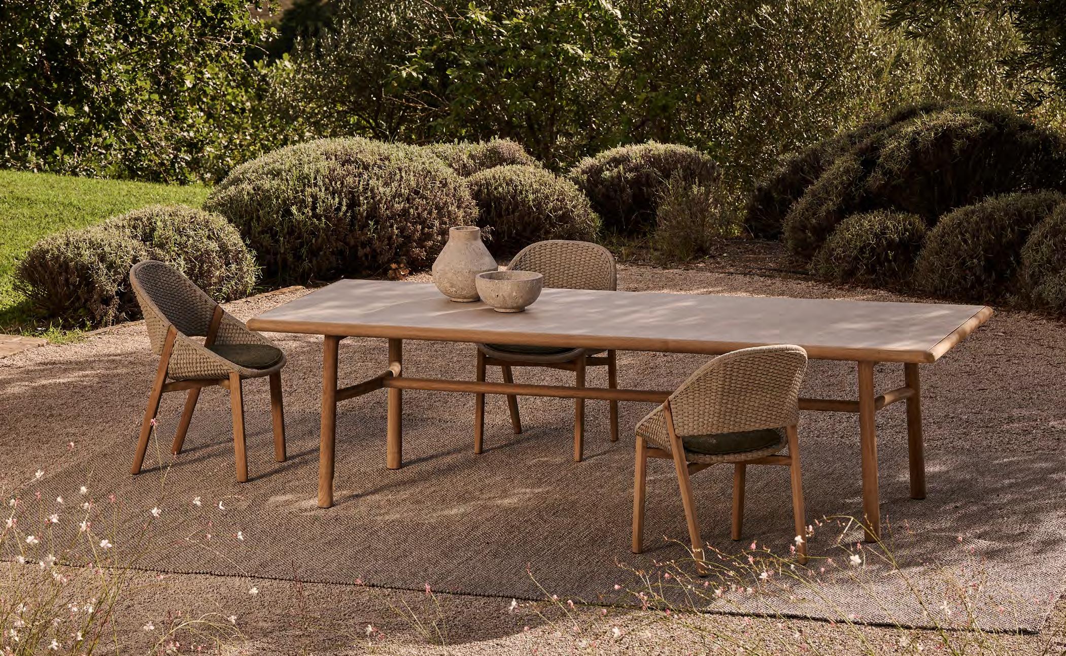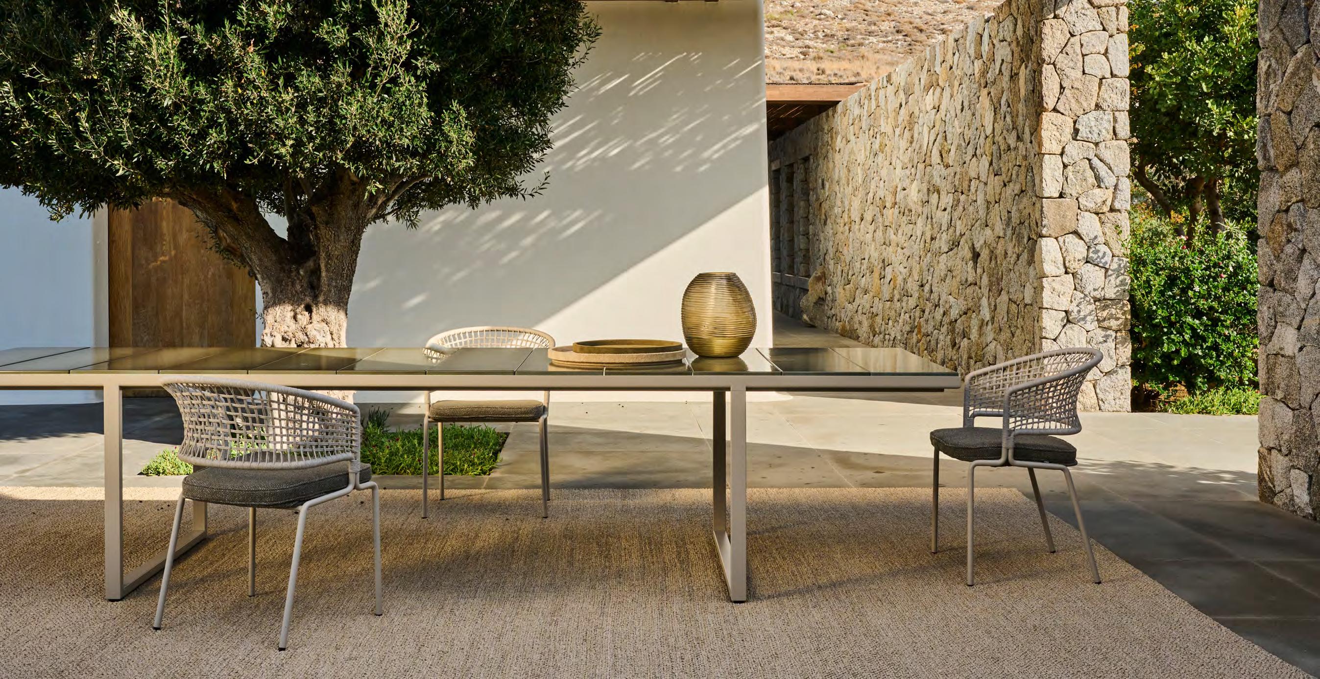gently flowing lines and ultra-light cast aluminium frame create a serene, understated presence. Handwoven Canax® detailing adds natural texture and lasting comfort, with finishes in linen aluminium with linen weave or dark bronze aluminium with copper weave. Designed for both dining and lounging, the collection includes an armchair, lounge chair, bench, dining tables with teak or ceramic tops on aluminium frames, and a lounger available with fixed legs, wheels, or stackable legs with wheels. Nagomi integrates effortlessly into any setting, offering spaces of quiet refinement.