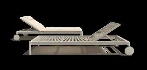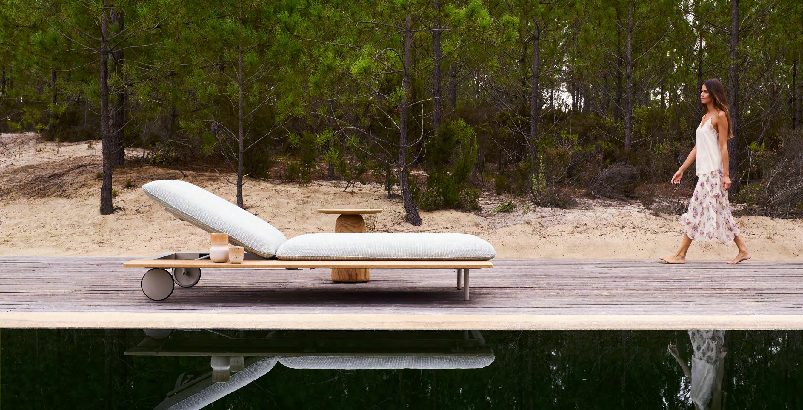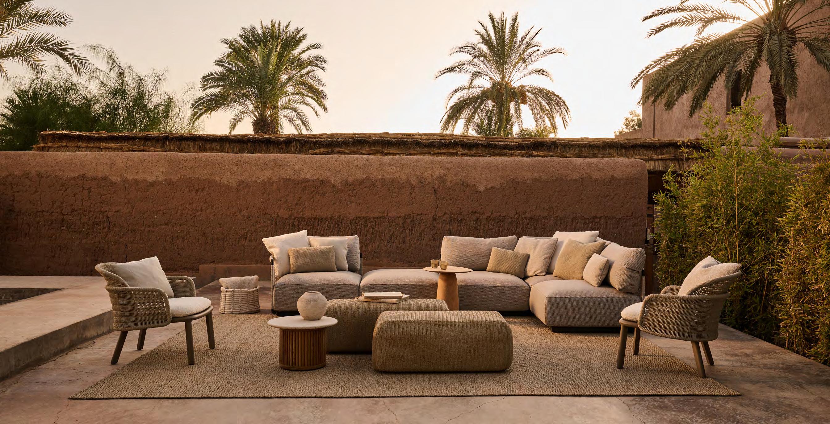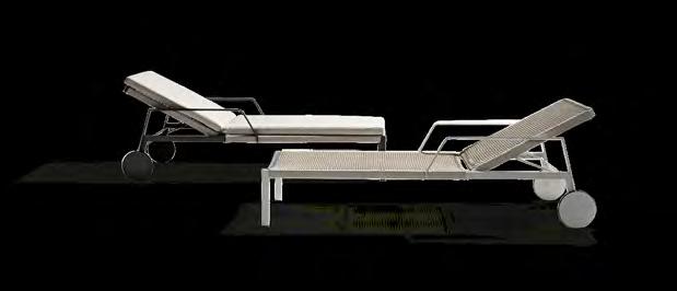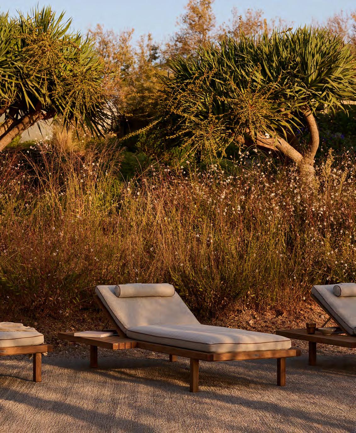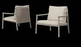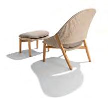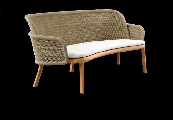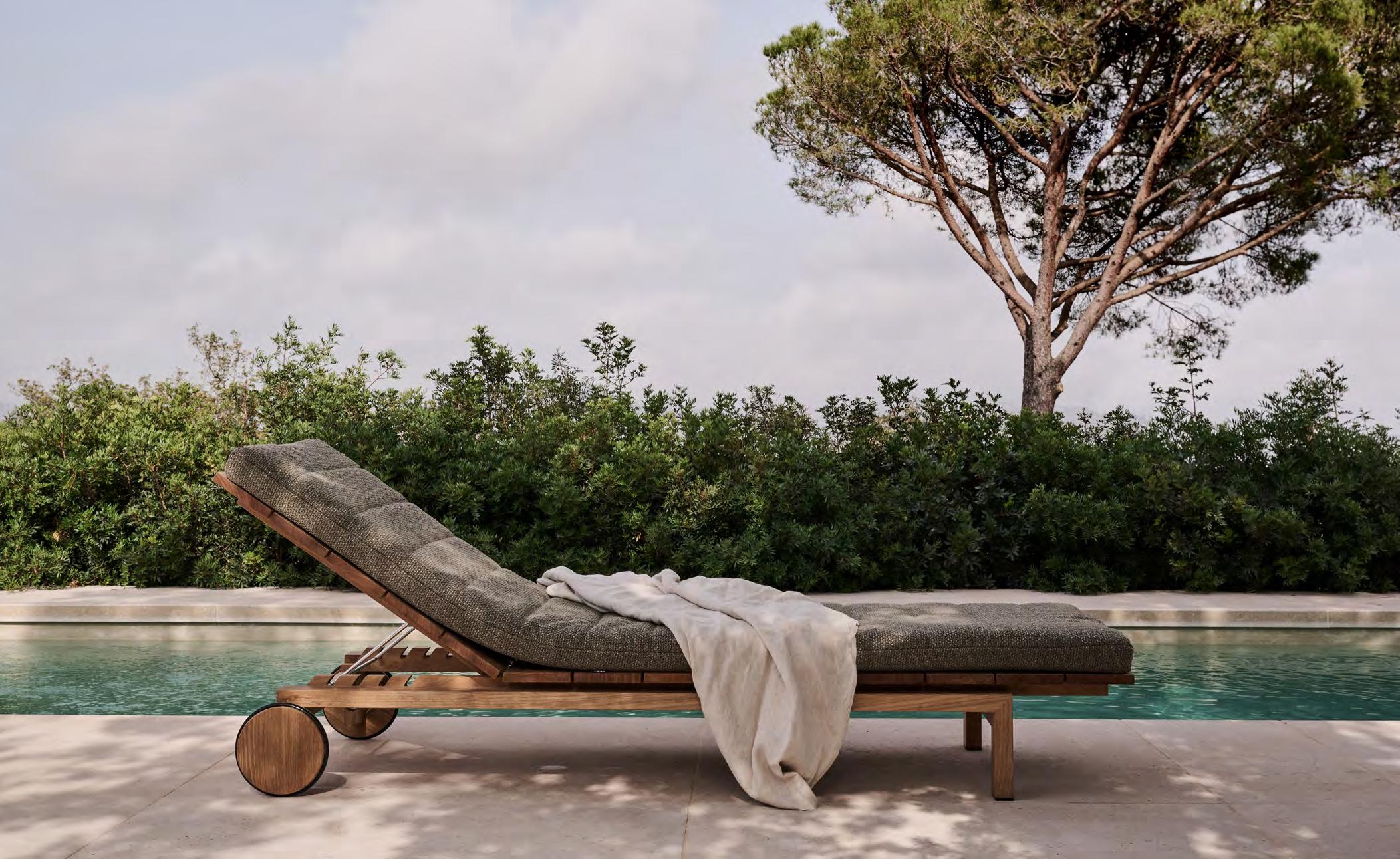 gently flowing lines and ultra-light cast aluminium frame create a serene, understated presence. Handwoven Canax® detailing adds natural texture and lasting comfort, with finishes in linen aluminium with linen weave or dark bronze aluminium with copper weave. Designed for both dining and lounging, the collection includes an armchair, lounge chair, bench, dining tables with teak or ceramic tops on aluminium frames, and a lounger available with fixed legs, wheels, or stackable legs with wheels. Nagomi integrates effortlessly into any setting, offering spaces of quiet refinement.