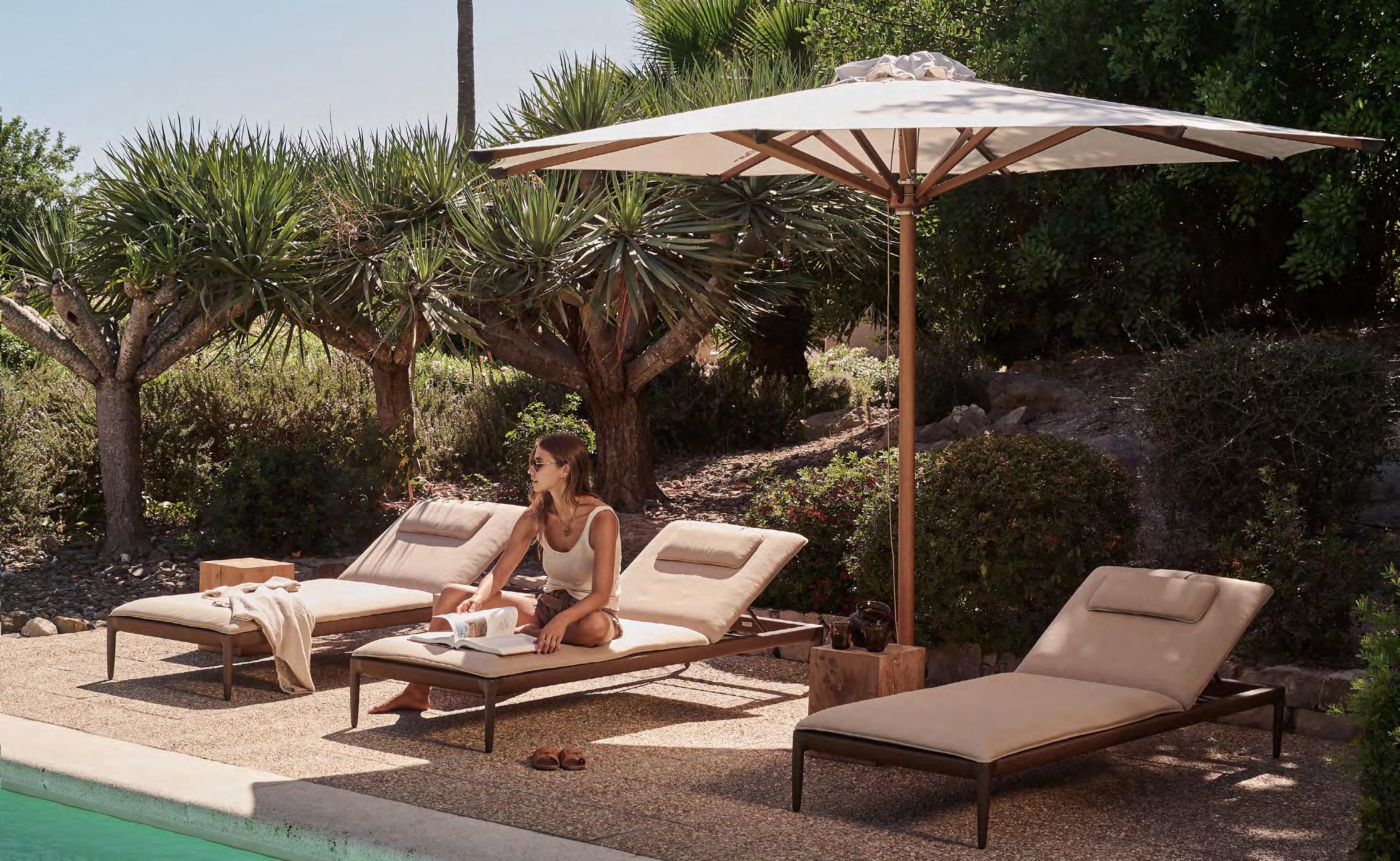 NAGOMI loungers in dark bronze, cushions and headrests in linen sandstone. ROOTS side tables. ECLIPSE umbrella with fabric in canvas and granite base.