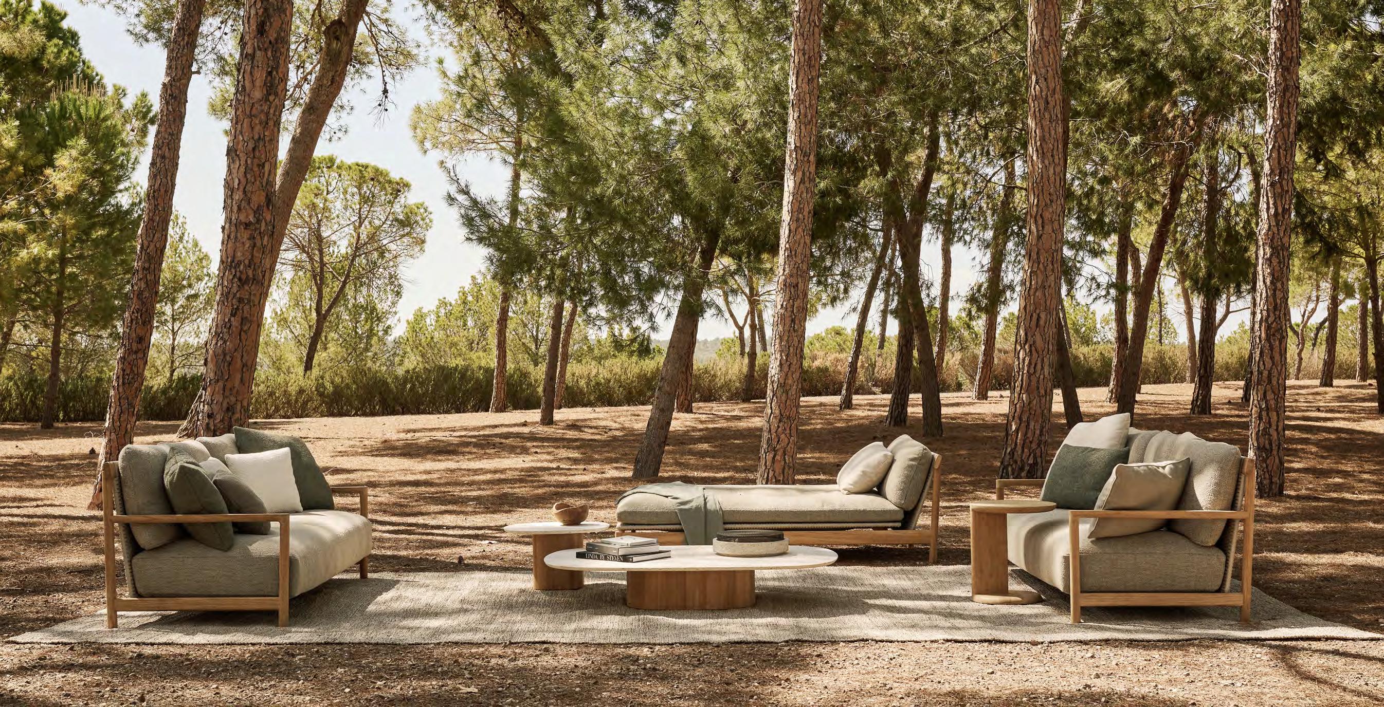 PURE sofa in teak with cushions in duas linen, deco cushions in naram almond, sujàn hemp, knit dunes with piping in natté ochre, naram verdant, sujàn hemp, sujàn ochre, knit dunes, and knit colorado.