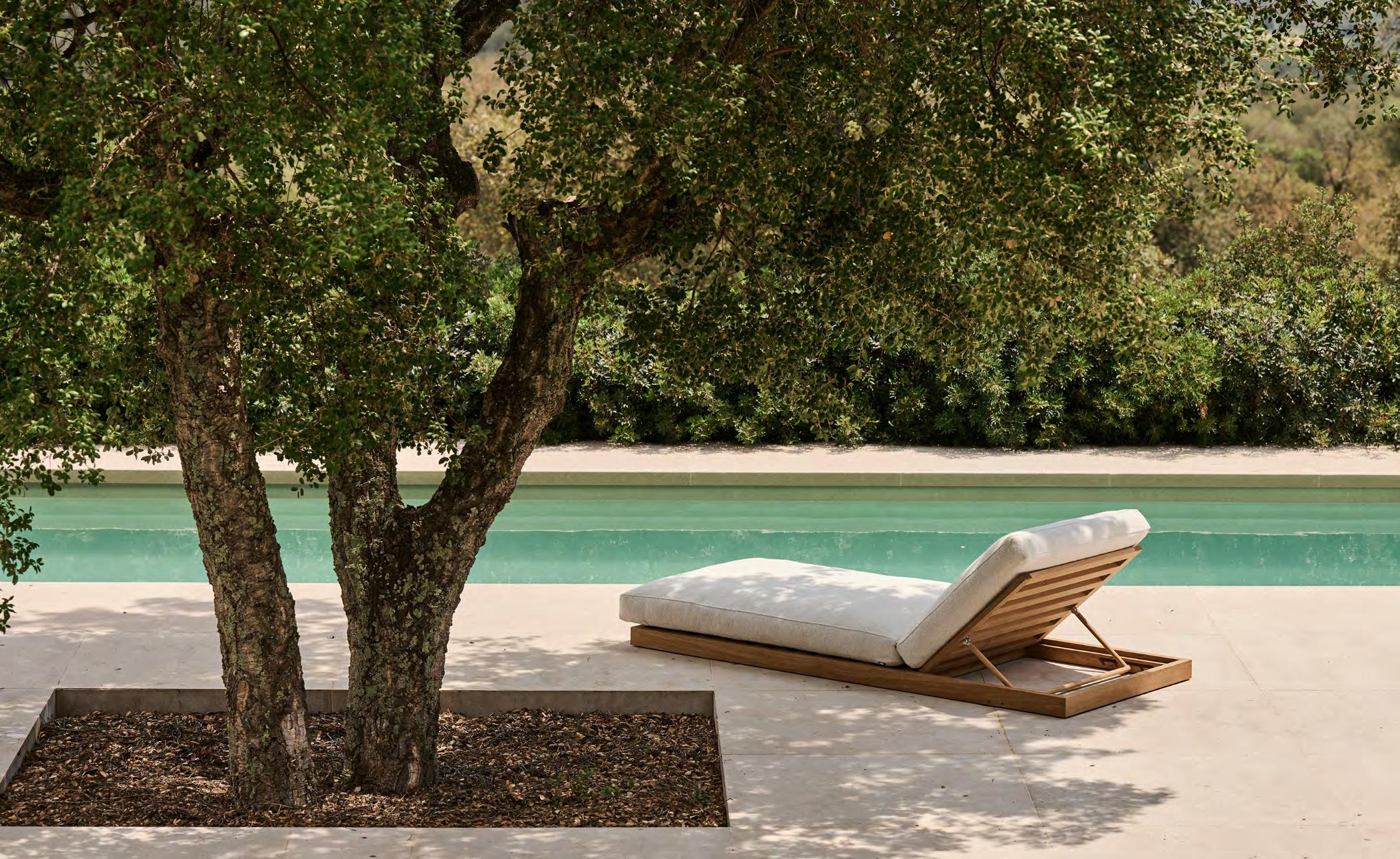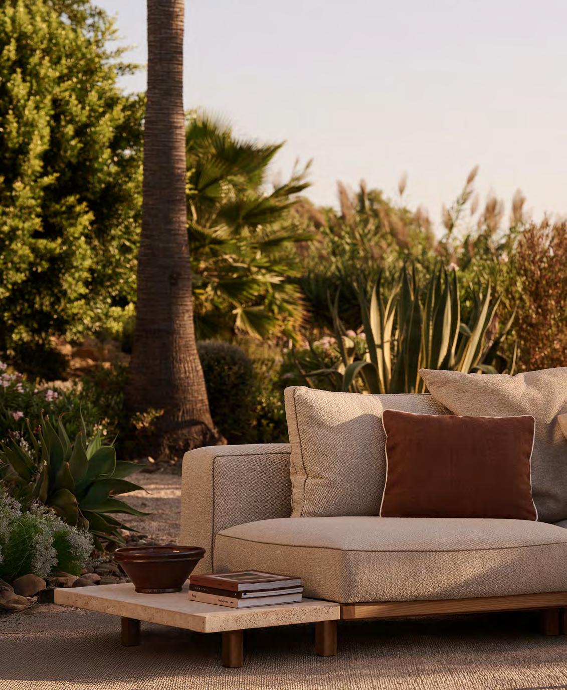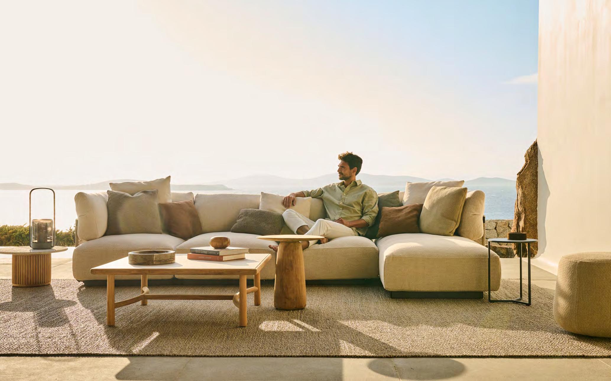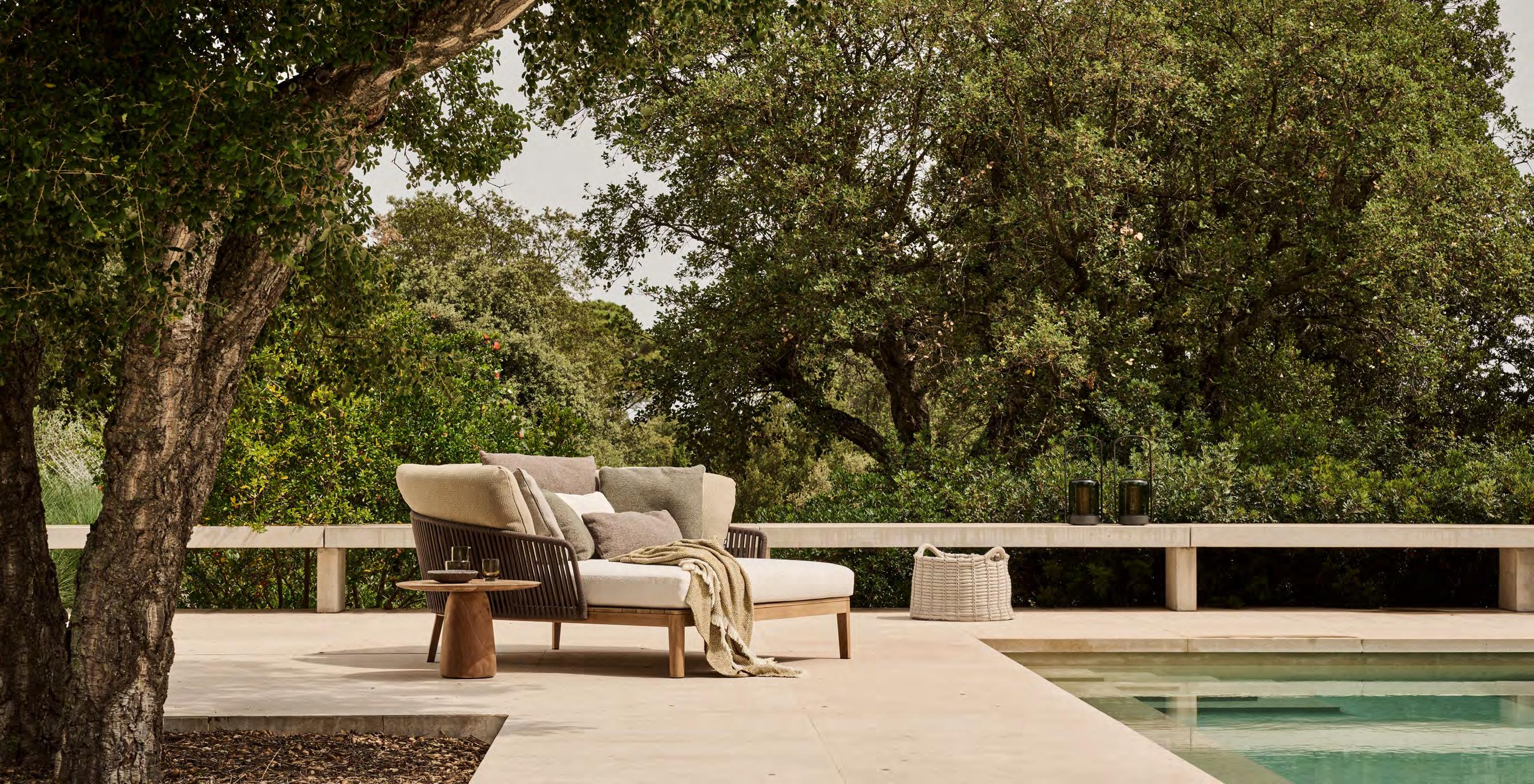Vis à Vis’ modular sofa has been reimagined with a softer silhouette and more voluminous cushion, outlined by its signature piping that lends a discreet graphic rhythm. The collection extends with a daybed and an organically shaped corner module, complemented by low tables in teak or travertine that connect with ease or stand gracefully on their own. Dining tables in the same materials bring a natural sense of unity to the setting. Every element of Vis à Vis is designed to invite personal compositions that fit gracefully into any outdoor environment.