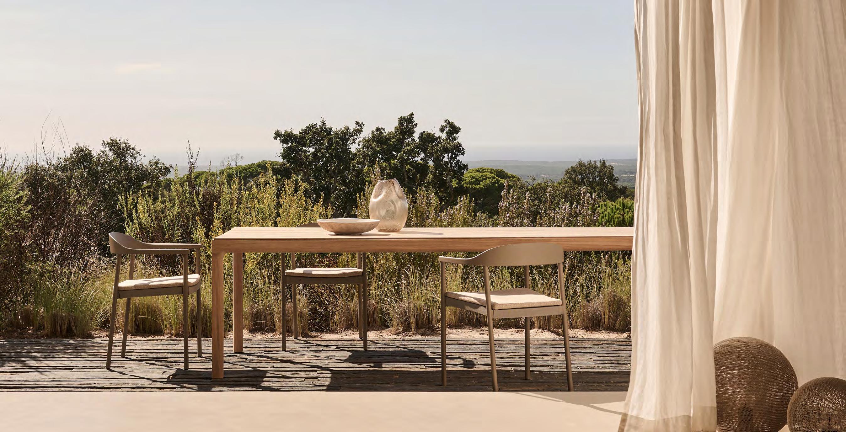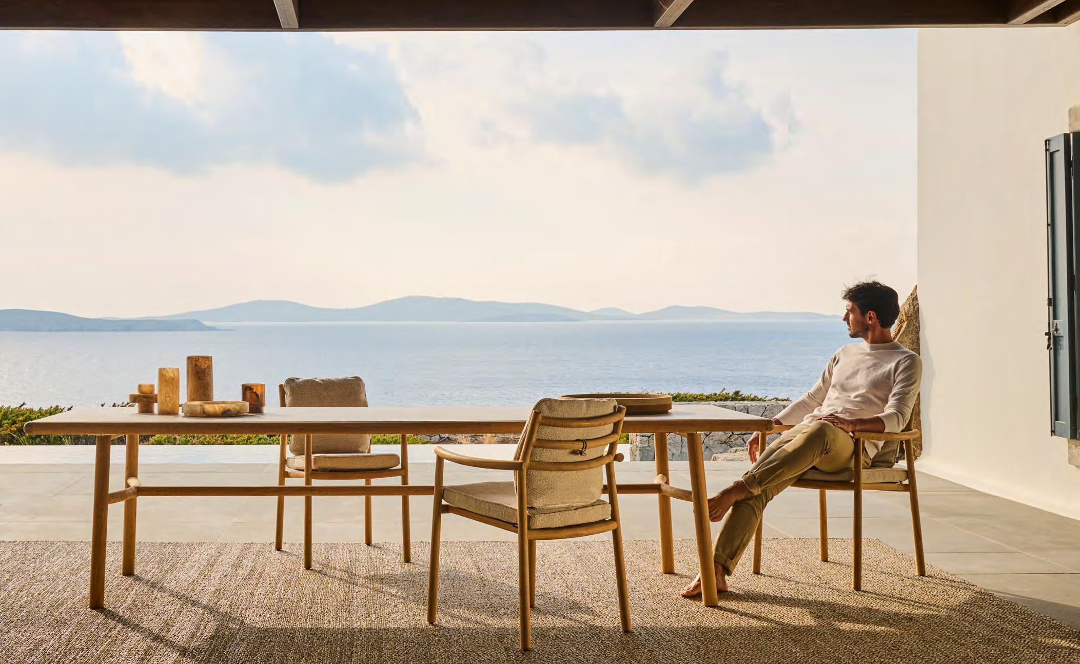 The refined Amanu collection brings interior quality outside, merging comfort and sustainability in a design that exudes purity. The dining chairs’ distinct woven, hemp-based sling seats appear to float effortlessly within the sleek teak frame. Central to the Amanu ensemble is the signature three-seat sofa with generously spacious seating. The collection’s daybed offers a refined retreat for basking in the sunlight or stargazing under the night sky. A selection of variously shaped coffee tables completes the collection, each imbued with the distinctive style of its dining table, completing outdoor settings elegantly.