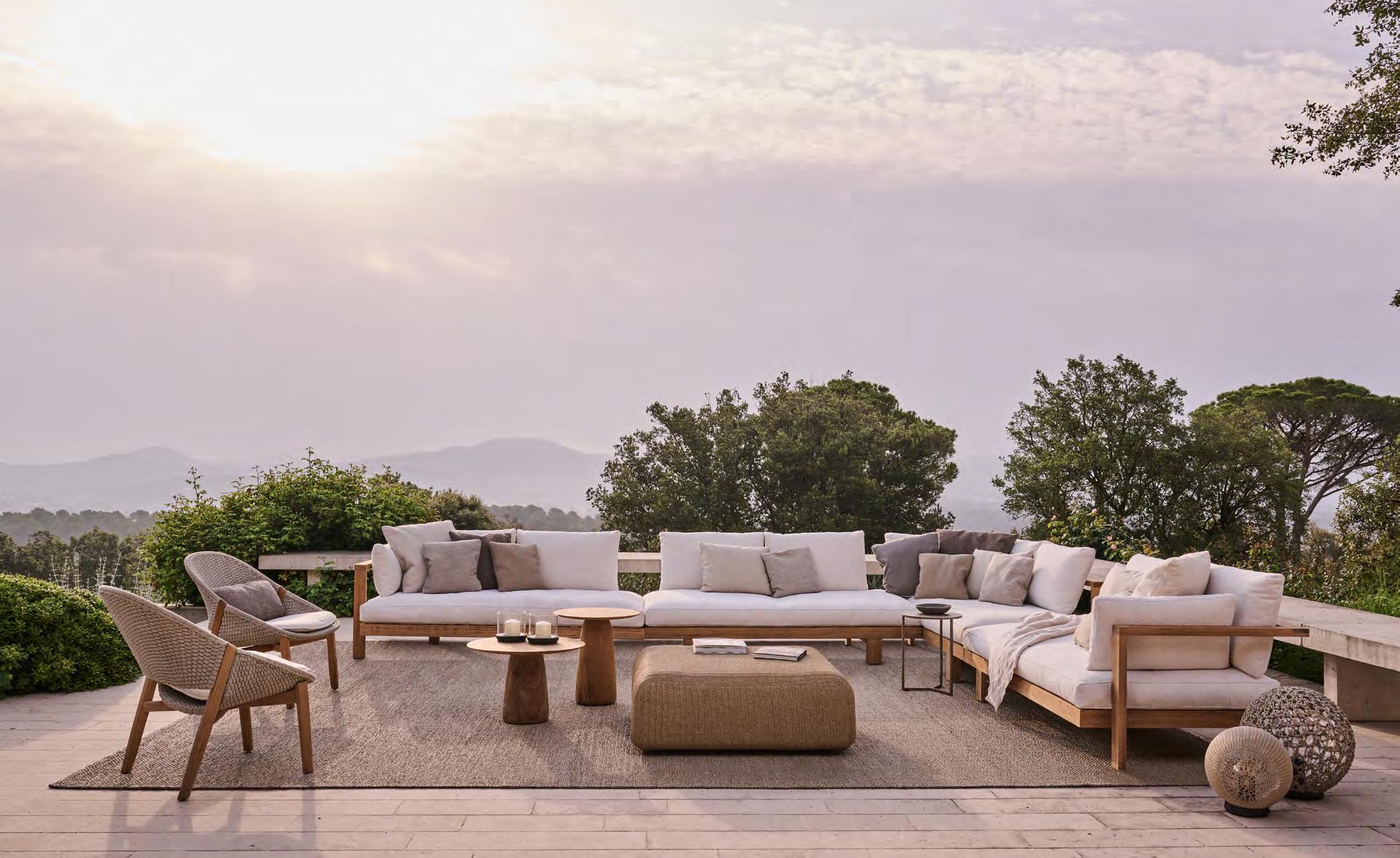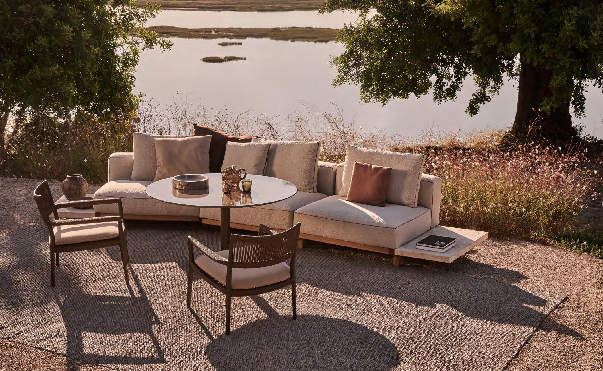 The reimagined Vis à Vis collection continues its story in warm, premium plantation teak and elegant travertine with subtle refinements to its modular character.