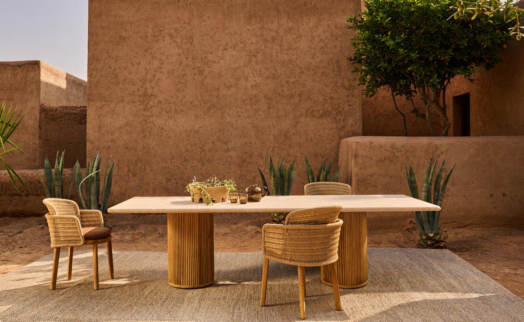 OTTO dining table rectangular with top in travertine. SURO armchairs in teak/hemp with cushions in naram copper. SHINDI rug in hemp.