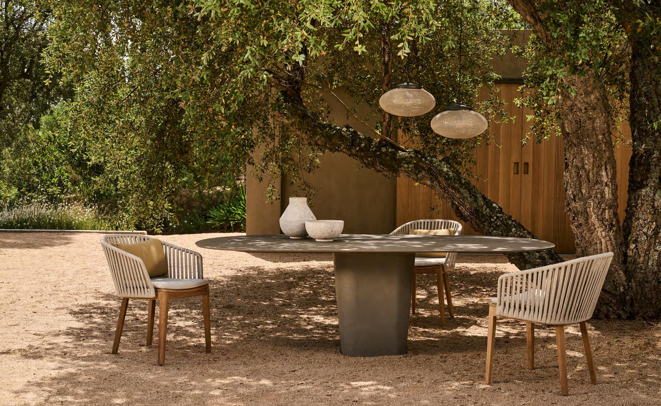 Lucca's dining table stands as a timeless centrepiece, its shield-shaped supports and rounded ceramic top embodying understated elegance, complementing any outdoor setting.