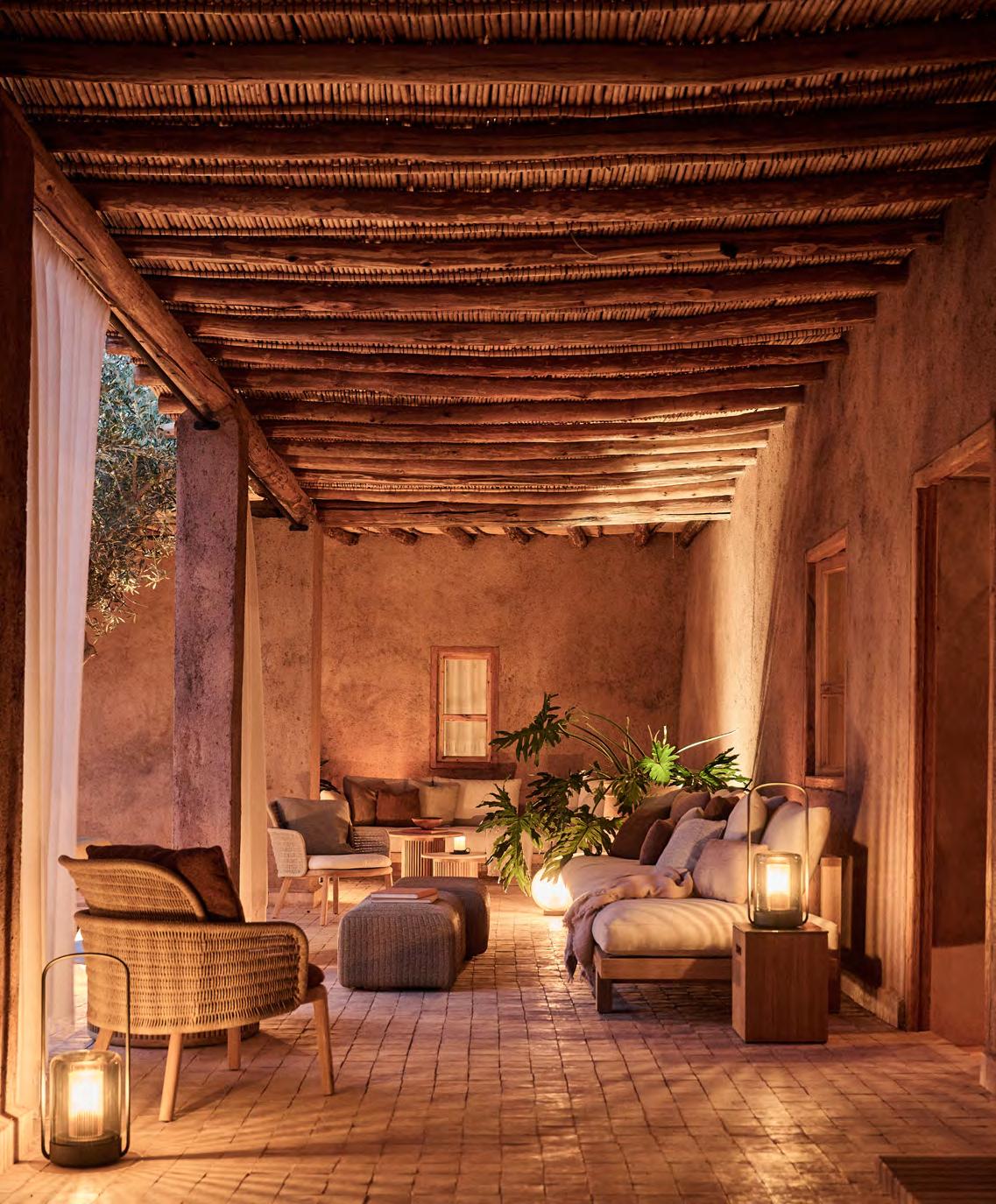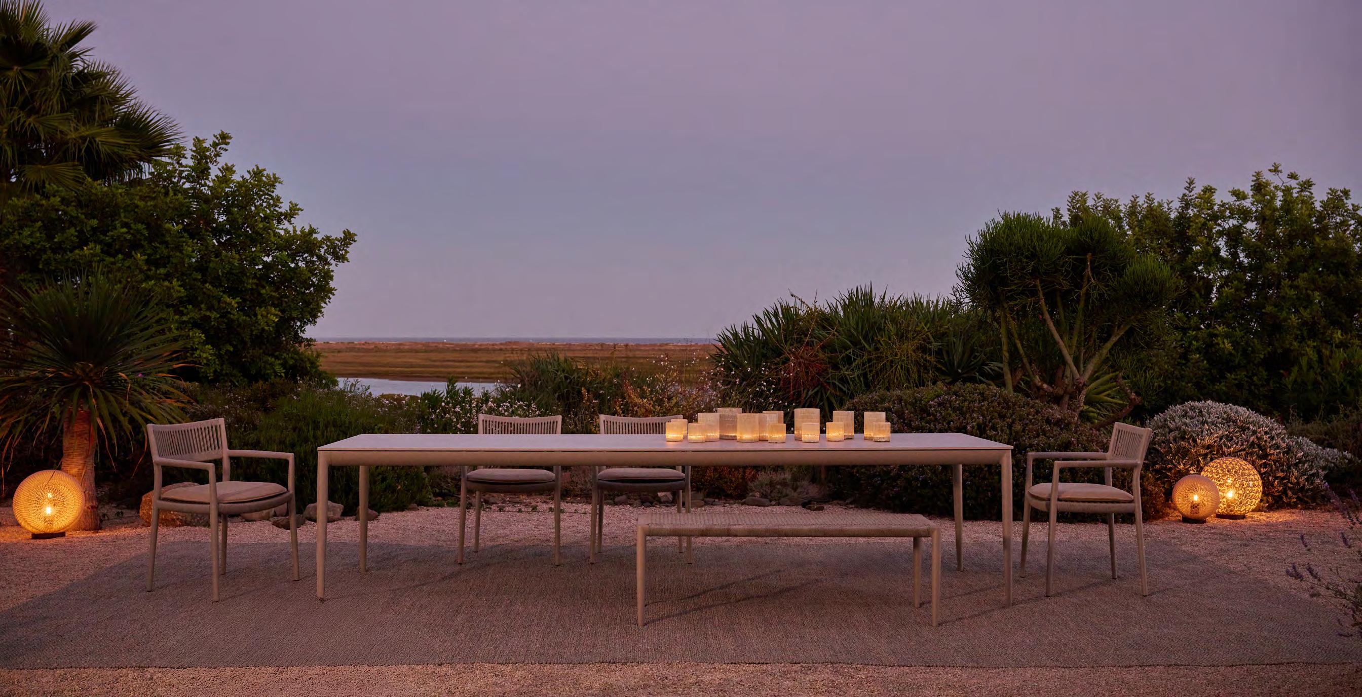 AMANU armchairs and dining table 350cm with top in ceramic sabbia, cushions in duas linen. LANTERNS high and low. SHINDI rug in linen.