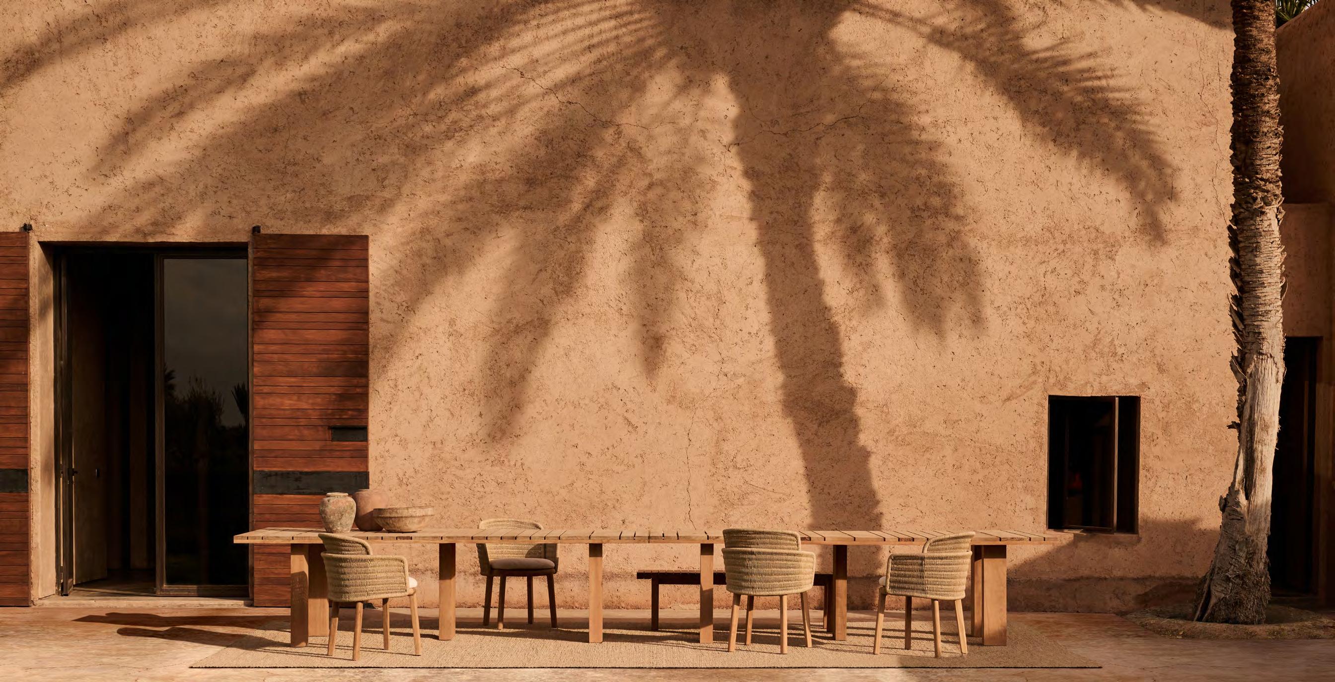 SURO dining table in teak, 2 x 280cm combined. SURO armchairs in teak/hemp with cushions in duas linen. VIS À VIS bench in teak. SHINDI rug in hemp.