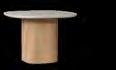 CESTA swivel lounge chairs in linen with cushions in naram ochre. OTTO low dining table ø148cm with top in ceramic sabbia.