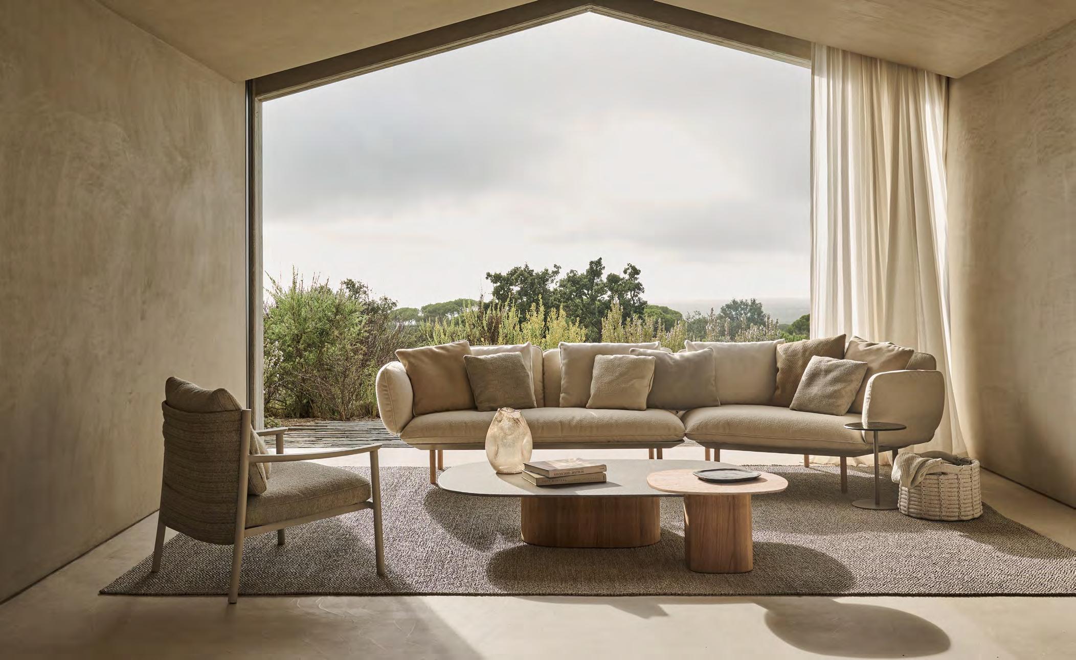 siva white cotton. AMANU round coffee table with top in ceramic sabbia. DUNES side and coffee table. SHINDI rug in linen