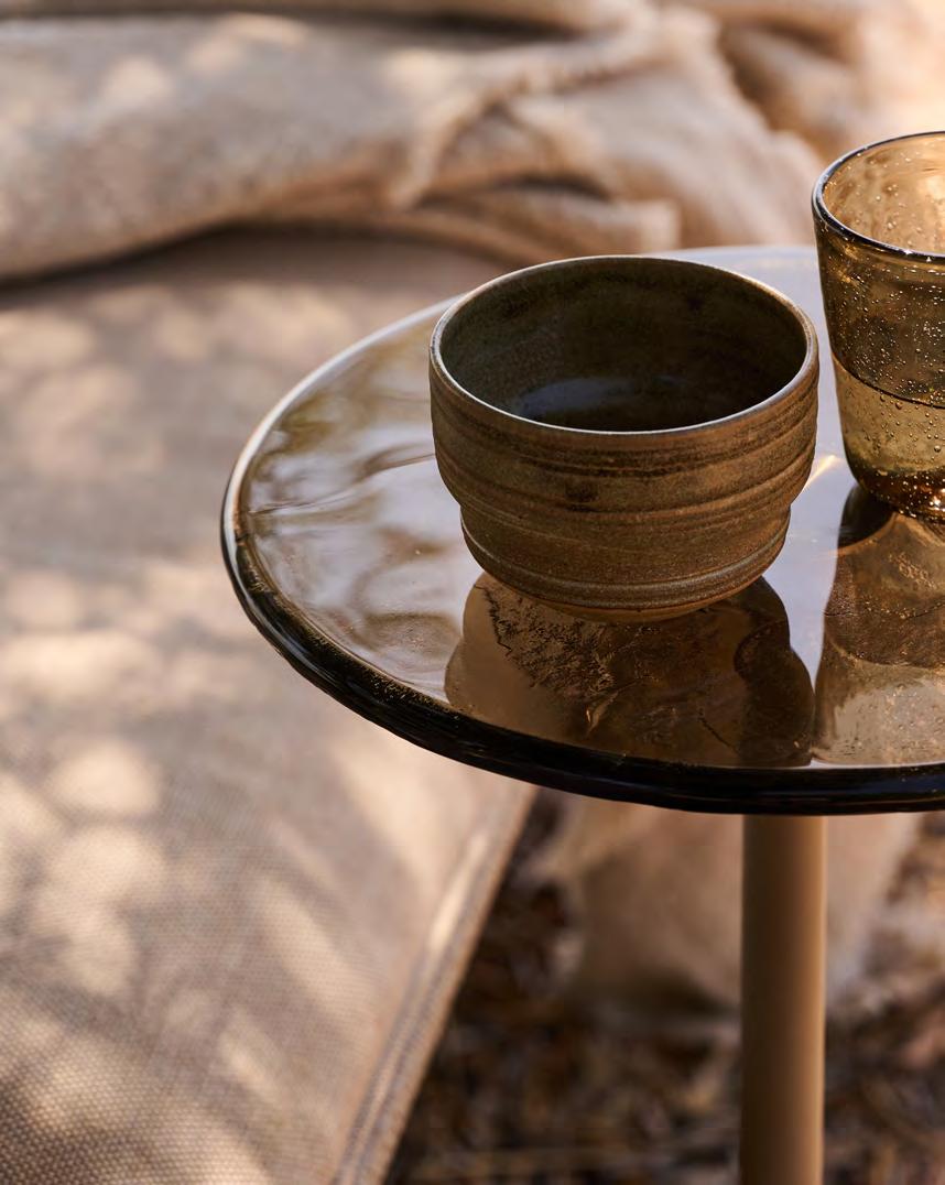 NAGOMI lounger in linen, cushion in linen sandstone. MARE side table in clay with top in amber glass.