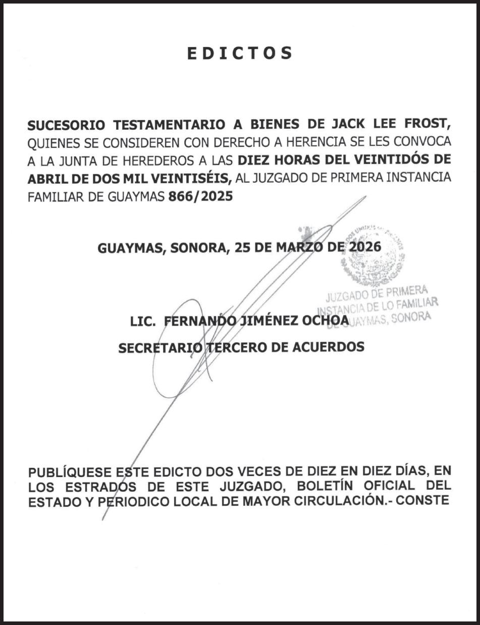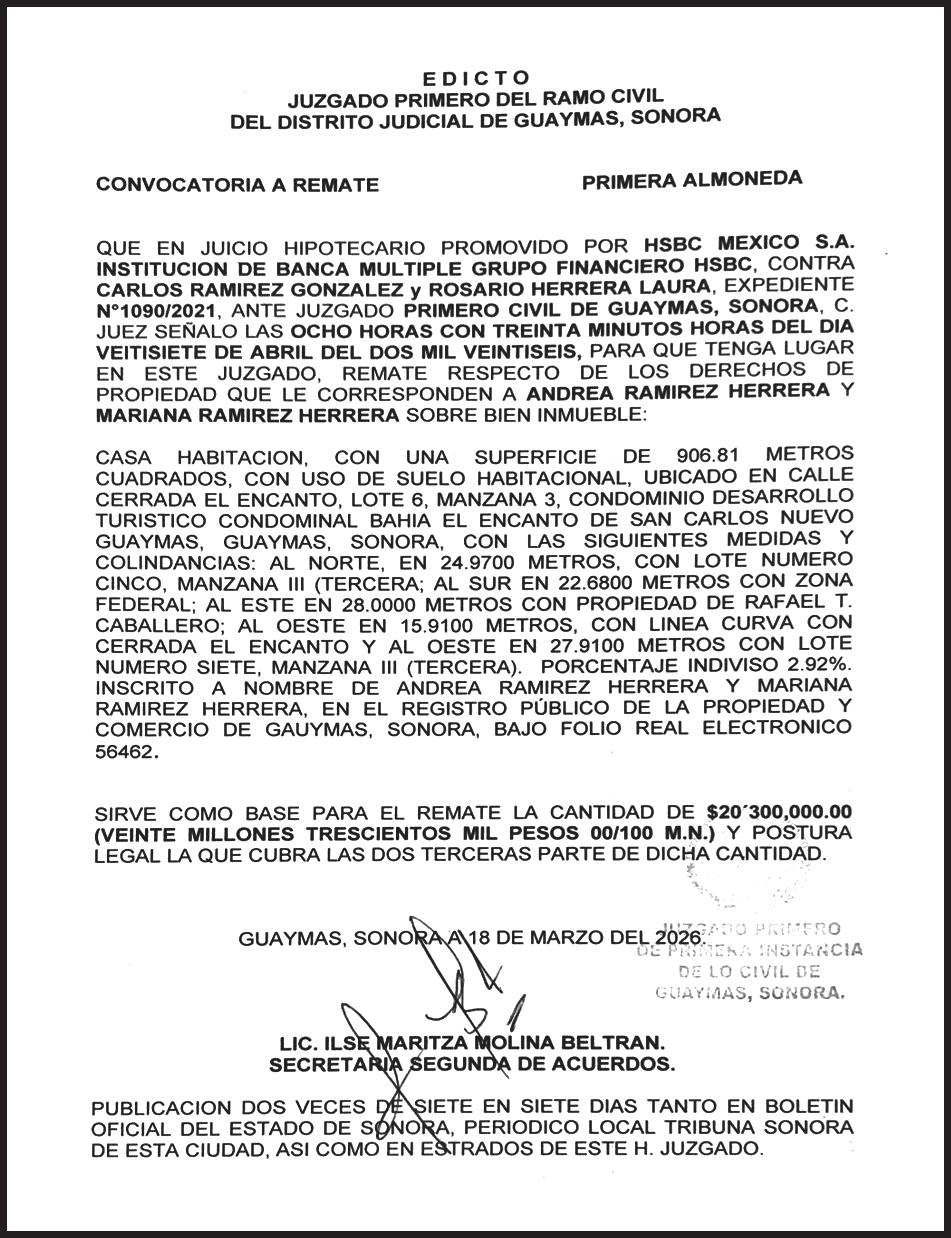 TRIBUNA SONORA, periodicidad Diario, Editor Responsable Sergio Marcial Garcia, Reserva de Derechos al Uso Exclusivo del Título 04-2025-052014313200-101, Certificados de Licitud de Título y Contenido 17817. Con domicilio de la publicación en Gral. José María Yáñez 2, San Benito, Hermosillo, C.P. 83190, Sonora, México. Impreso y distribuido por Líneas Sonora Hoy CW, Blvd. Rodolfo Elías Calles #278 Ote. Col. Campestre, entre Durango y Juan Álvarez, C.P. 85160, Cajeme, Sonora.