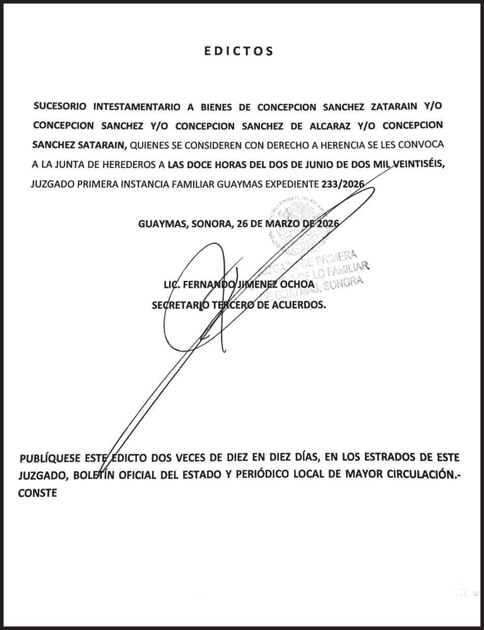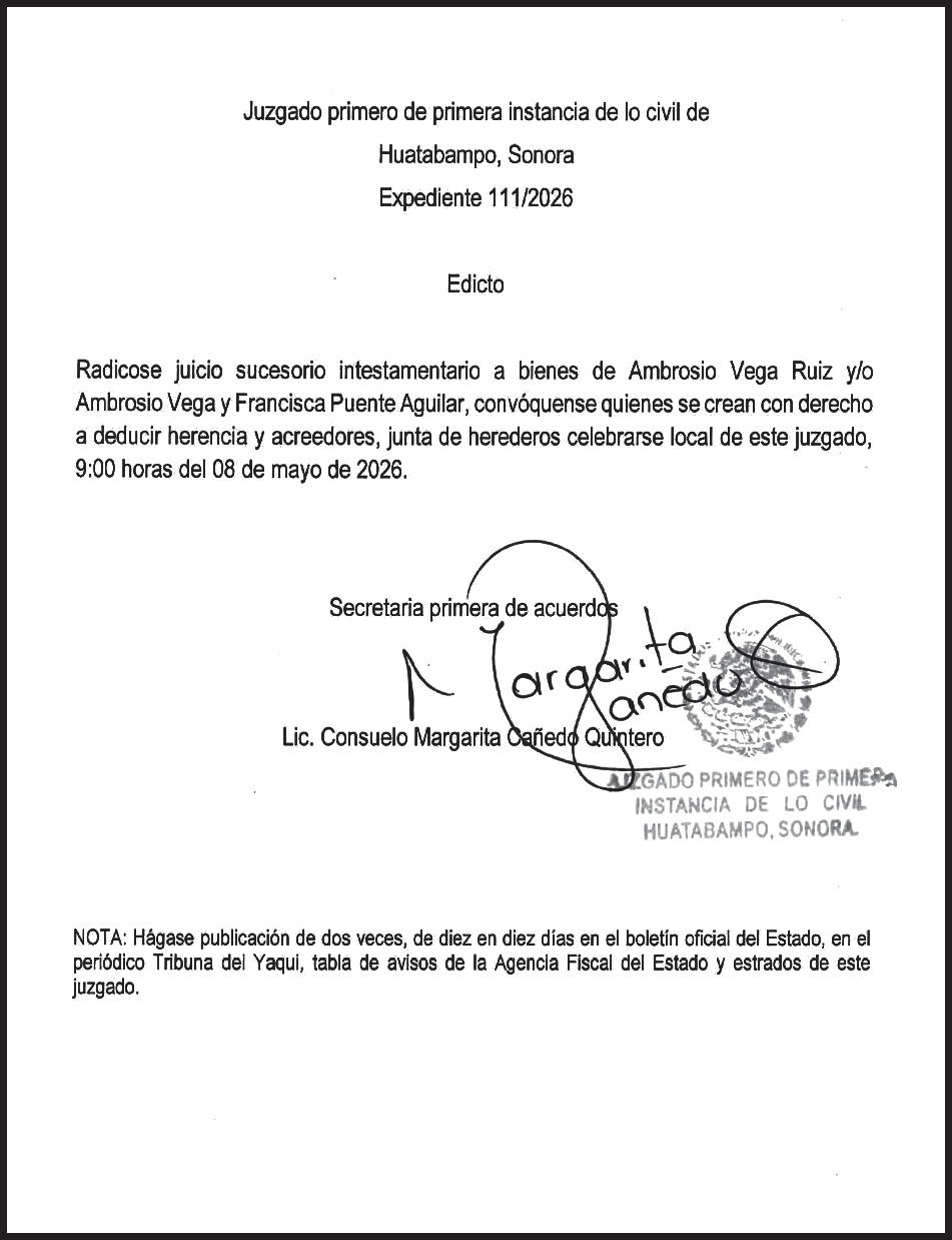 TRIBUNA SONORA, periodicidad Diario, Editor Responsable Sergio Marcial Garcia, Reserva de Derechos al Uso Exclusivo del Título 04-2025-052014313200-101, Certificados de Licitud de Título y Contenido 17817. Con domicilio de la publicación en Gral. José María Yáñez 2, San Benito, Hermosillo, C.P. 83190, Sonora, México. Impreso y distribuido por Líneas Sonora Hoy CW, Blvd. Rodolfo Elías Calles #278 Ote. Col. Campestre, entre Durango y Juan Álvarez, C.P. 85160, Cajeme, Sonora. • Conmutador: (644) 410-3030