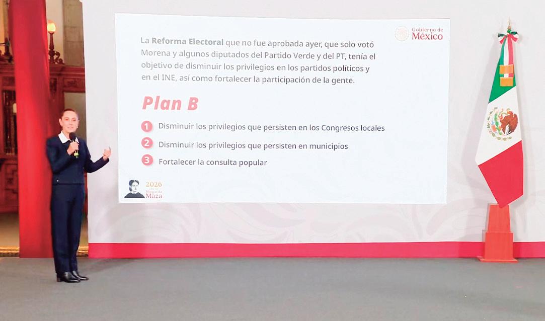 Tras ser rechazada por la Cámara de Diputados la iniciativa original de su Reforma Electoral, Sheinbaum dio detalles de su anunciado Plan B, el cual presentará el próximo lunes, con el cual buscará reducir privilegiosencongresosestatales y en municipios, además de fortalecer la consulta popular.
