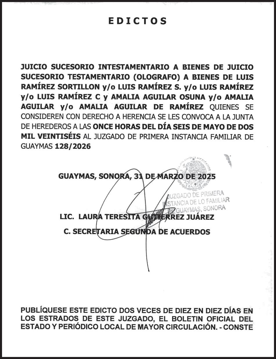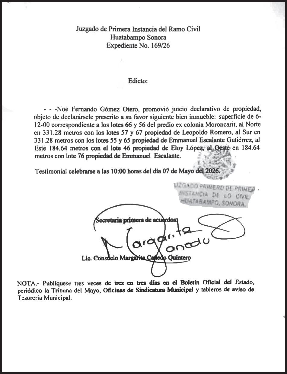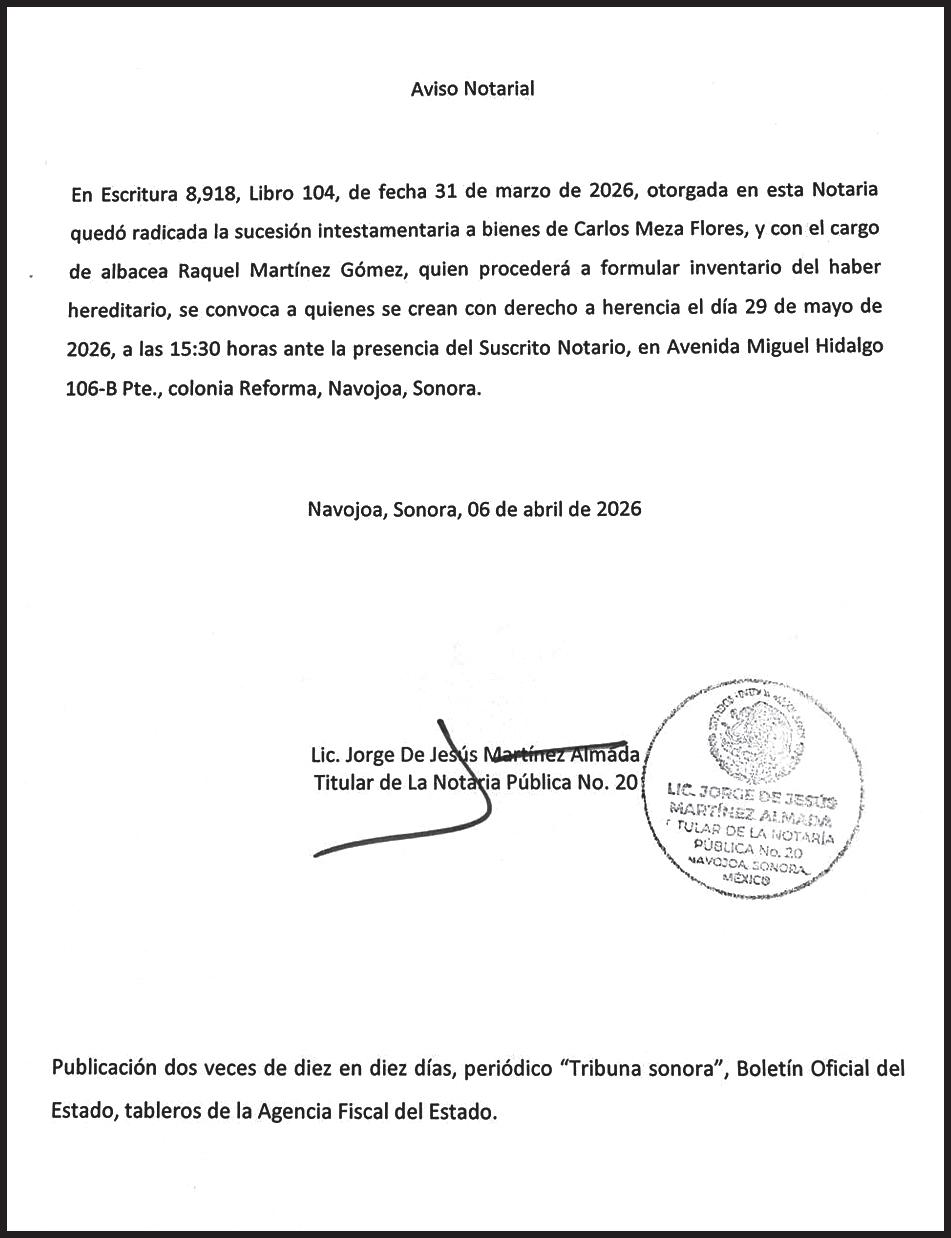TRIBUNA SONORA, periodicidad Diario, Editor Responsable Sergio Marcial Garcia, Reserva de Derechos al Uso Exclusivo del Título 04-2025-052014313200-101, Certificados de Licitud de Título y Contenido 17817. Con domicilio de la publicación en Gral. José María Yáñez 2, San Benito, Hermosillo, C.P. 83190, Sonora, México. Impreso y distribuido por Líneas Sonora Hoy CW, Blvd. Rodolfo Elías Calles #278 Ote. Col. Campestre, entre Durango y Juan Álvarez, C.P. 85160, Cajeme, Sonora.