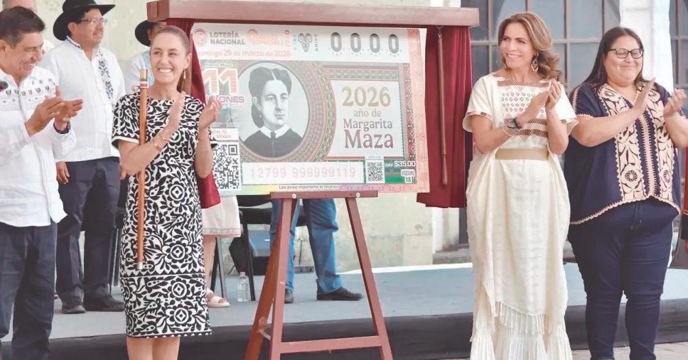 La presidenta Claudia Sheinbaum y la directora general de Lotería Nacional, Olivia Salomón, develaron ayer el billete conmemorativo dedicado al ‘2026, año de Margarita Maza’. El evento, celebrado en Guelatao de Juárez, Oaxaca, se enmarcó en la ceremonia del 220 aniversario del natalicio de Benito Juárez, con la presencia del