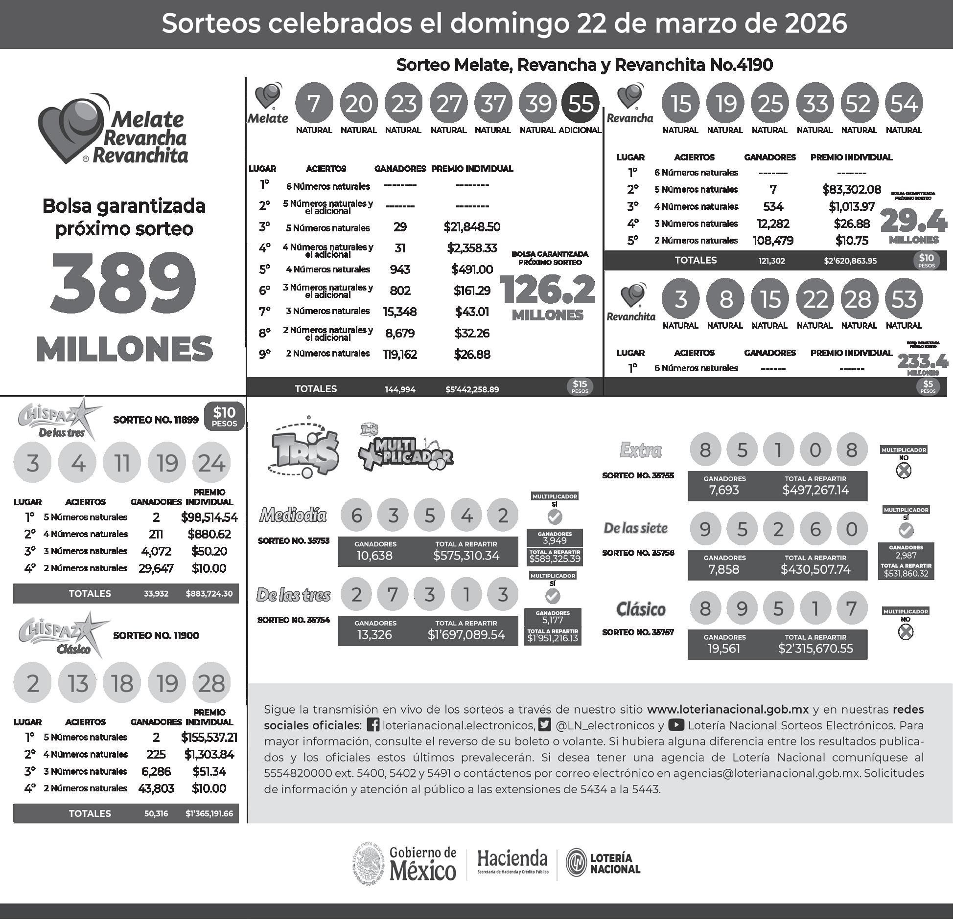 El Premio Mayor es de 11 millones de pesos en una serie, con una bolsa total repartible de 43 millones de pesos entre todos los premios. El sorteo será el próximo domingo 29 de marzo.