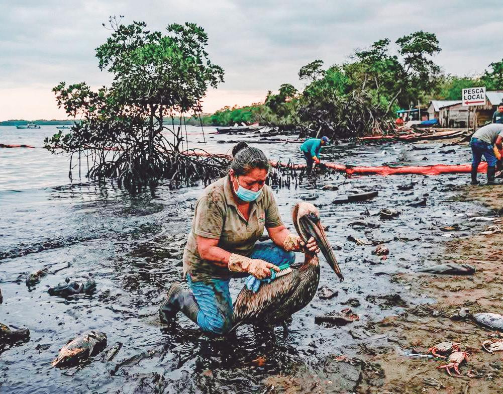 Elementos limpian la zona contaminada afectada por el derrame de petróleo