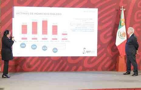 Rosa Icela Rodríguez informó brevemente que durante octubre hubo un “leve repunte” en la cifra de homicidios dolosos en el país. Sin embargo, resaltó que a pesar del repunte, en los primeros 20 días de noviembre hubo una “importante disminución”, pues la estimación es de dos mil 395 víctimas, es decir, 22 por ciento menos que el máximo histórico de 2018 y 13.4 por ciento que octubre. Además, la secretaria de Seguridad