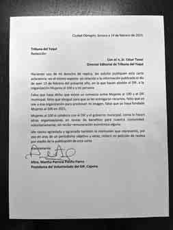 “Haciendo uso de mi derecho de réplica, les solicito publiquen esta carta aclaratoria en relación a la información publicada el día de ayer 13 de febrero del presente año, en la que hacen alusión al DIF, a la organización Mujeres al 100 y a mi persona.