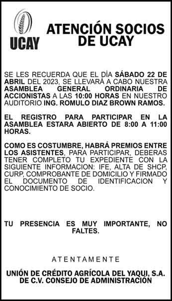 JJUEVES 20.4.2023 SUR DE SONORA AÑO LV. ED 21765 12 páginas 2 cuerpos $12.00 facebook.com/tribunasonora twitter.com@tribunasonora Libre expresión al servicio de la verdad