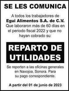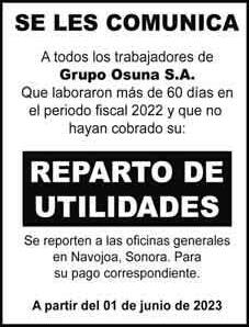 *Límites superiores del Conteo Rápido del INEo rápido Coahuila Conteo rápido Estado de México 0 0 Manolo Jiménez (PRI y aliados) Armando Guadiana (Morena) 55.7% 19.9% Delfina Gómez (Morena) 54% Alejandra del Moral (PRI y aliados) 45% L LUNES 5.6.2023 SUR DE SONORA AÑO LV. ED 21810 12 páginas 2 cuerpos $12.00 facebook.com/tribunasonora twitter.com@tribunasonora Libre expresión al servicio de la verdad