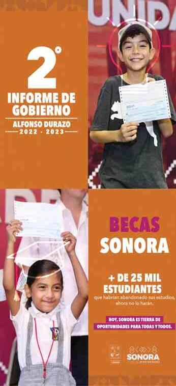 En este segundo año de gobierno, se ha consolidado el programa de becas Sonora de Oportunidades como el más grande de la historia de la entidad y, con ello, se ha logrado apoyar a más de 110 mil estudiantes de educación básica y universidades para que continúen sus estudios y no se vean en la necesidad de suspenderlos por limitaciones económicas, destacó el gobernador Alfonso Durazo Montaño.