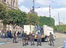 Desde mediodía una docena de trabajadores han comenzado la instalación de estas vallas metálicas que miden cerca de tres metros y que se conectan a las vallas que resguardan Palacio Nacional desde el lunes pasado previo a la marcha por los nueve años de la desaparición de los 43 normalistas de Ayotzinapa.