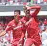 El primero del canterano de Cruz Azul llegó de volea, a los 20 minutos, cuando aprovechó un error del guardameta para anotar golazo de media tijera: en saque de banda, Giménez recibe la pelota en el área, y tras una serie de rebotes, el portero intentó ir por el balón, pero