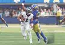 Jalen Hurts lanzó para 303 yardas con un touchdown y corrió para 72 yardas y otra anotación, para que los Philadelphia Eagles superaran 23-14 a Los Angeles Rams este domingo para mantenerse invictos.