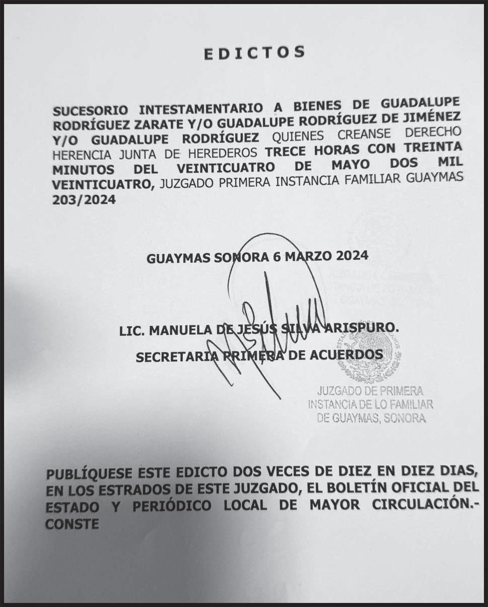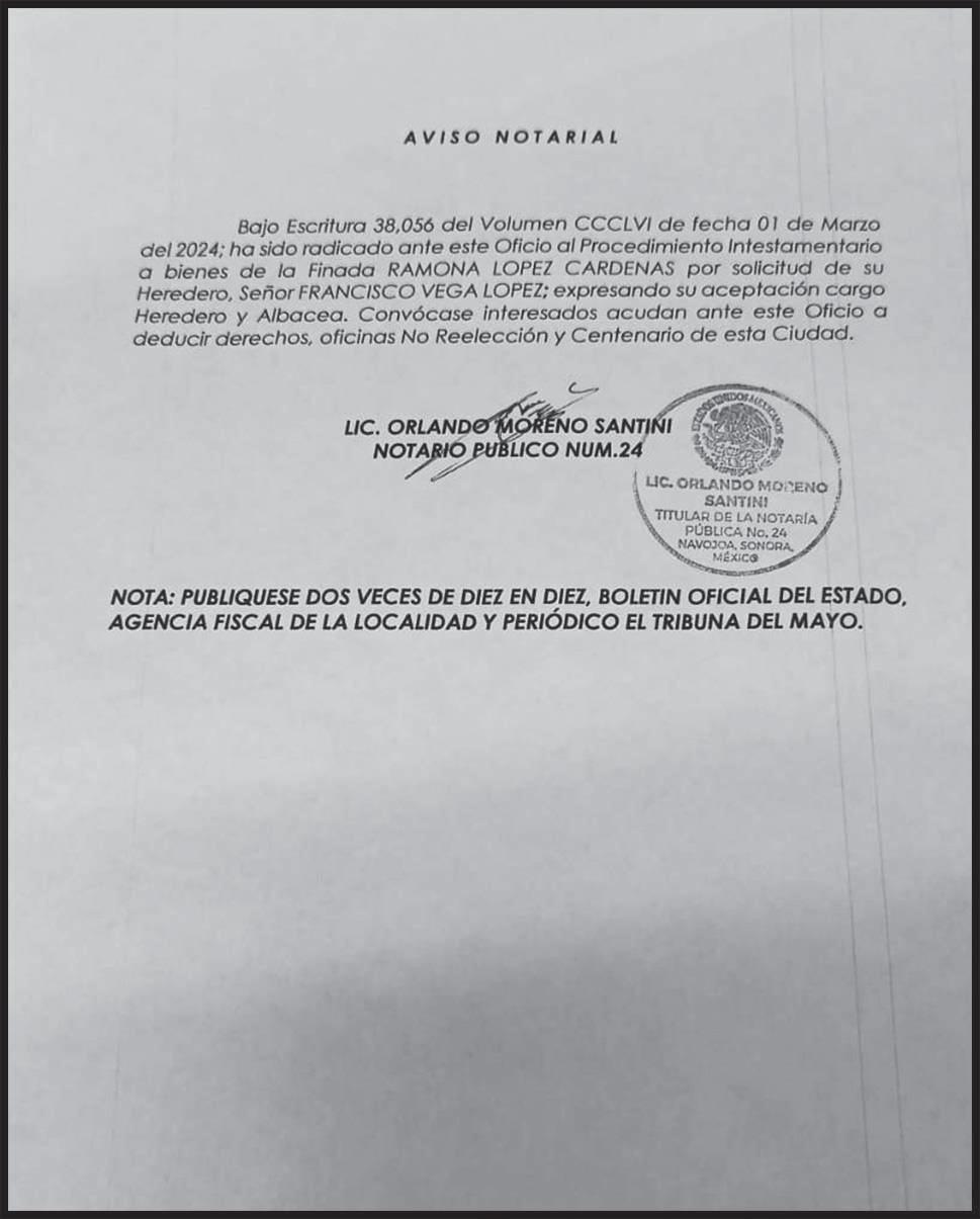 TRIBUNA DEL YAQUI, publicación de circulación diaria. Año LI. Certificado de Licitud de Título y Contenido: 16469. Reserva de Derechos al Uso Exclusivo: 04-2016-041313515500-101, otorgado por el Instituto Nacional del Derecho del Autor. Publicado y distribuído por TRIBUNA DEL YAQUI S.A. DE C.V., Domicilio de la impresión en Guadalupe Victoria No.115 C.P. 85160 Col. Campestre, Ciudad Obregón, Sonora, Tel. 410 30 30. El contenido de los artículos es responsabilidad exclusiva de los autores. Queda estrictamente prohibida la reproducción total o parcial de los contenidos e imágenes de la publicación sin previa autorización de GILBERTO FELIX BOURS. Miembro de la Sociedad Interamericana de Prensa.