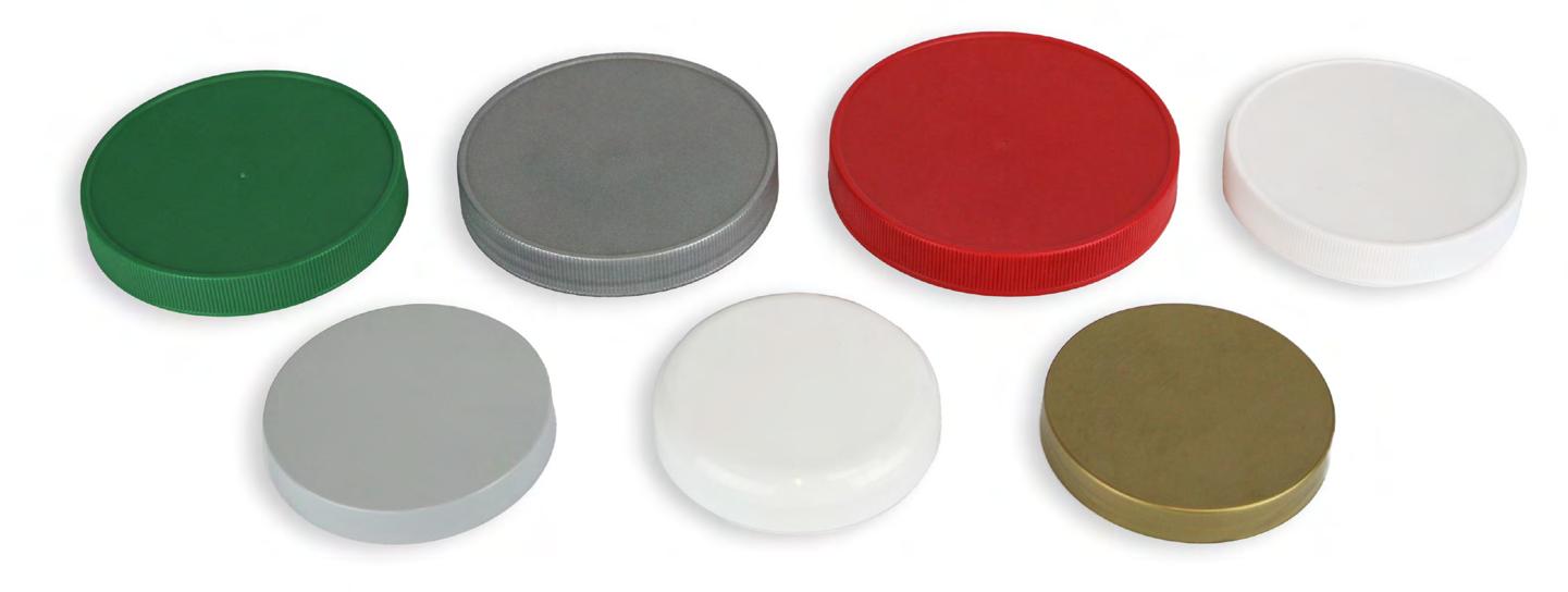 Various colors, sizes, and styles available including: large diameter closures (70-120mm), dispensing (flip tops, spout caps, spice sifters), continuous thread (CT), embossed/debossed, smooth/ribbed closures