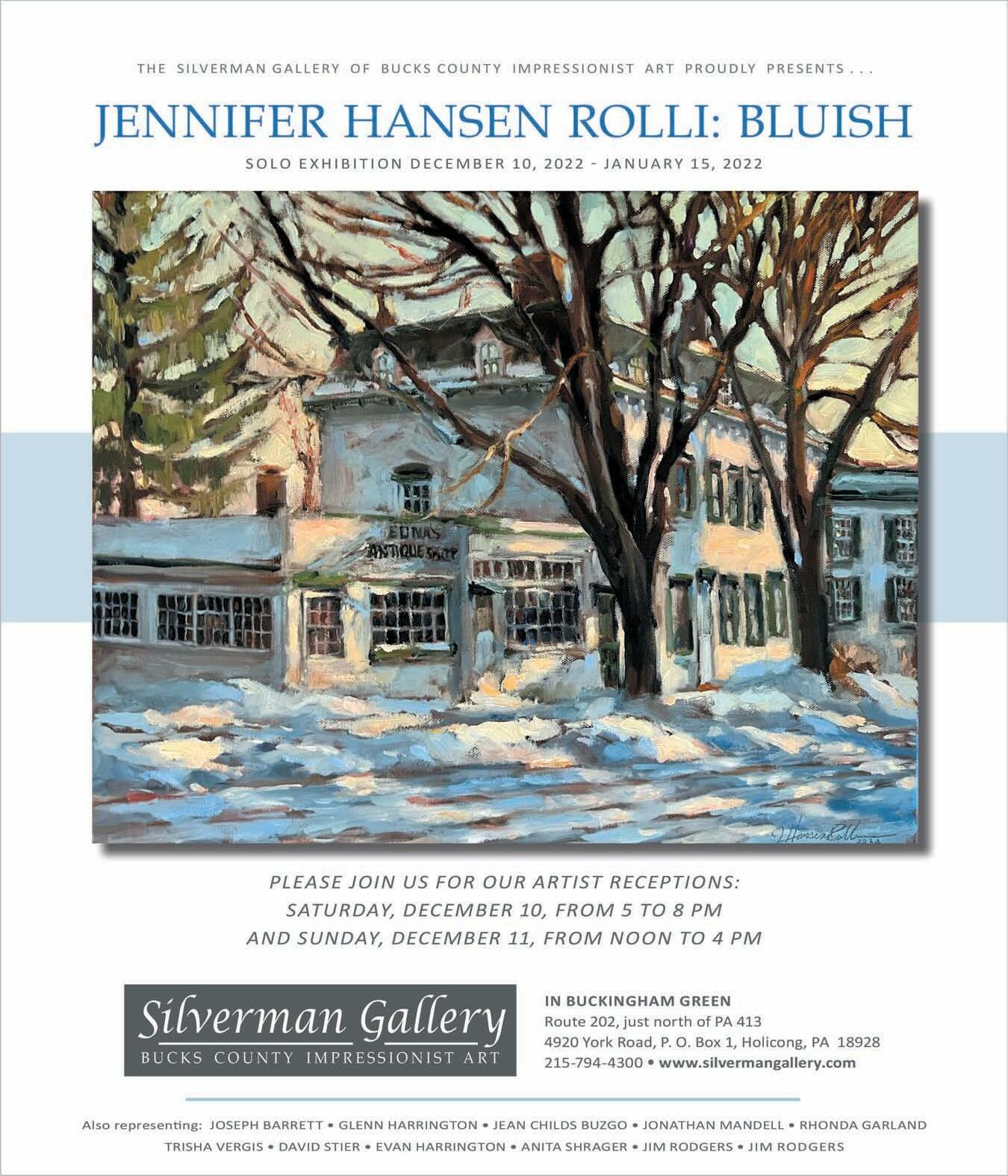 Jennifer Hansen Rolli: Bluish Silverman Gallery of Impressionist Art Route 202, just north of PA 413 4920 York Rd., Holicong, PA 215-794-4300 Silvermangallery.com Opening Recep. 12/10, 5-8 & 12/11, noon-4 Open W-Sat. 11-6; Sund., 11-4; and by appt.