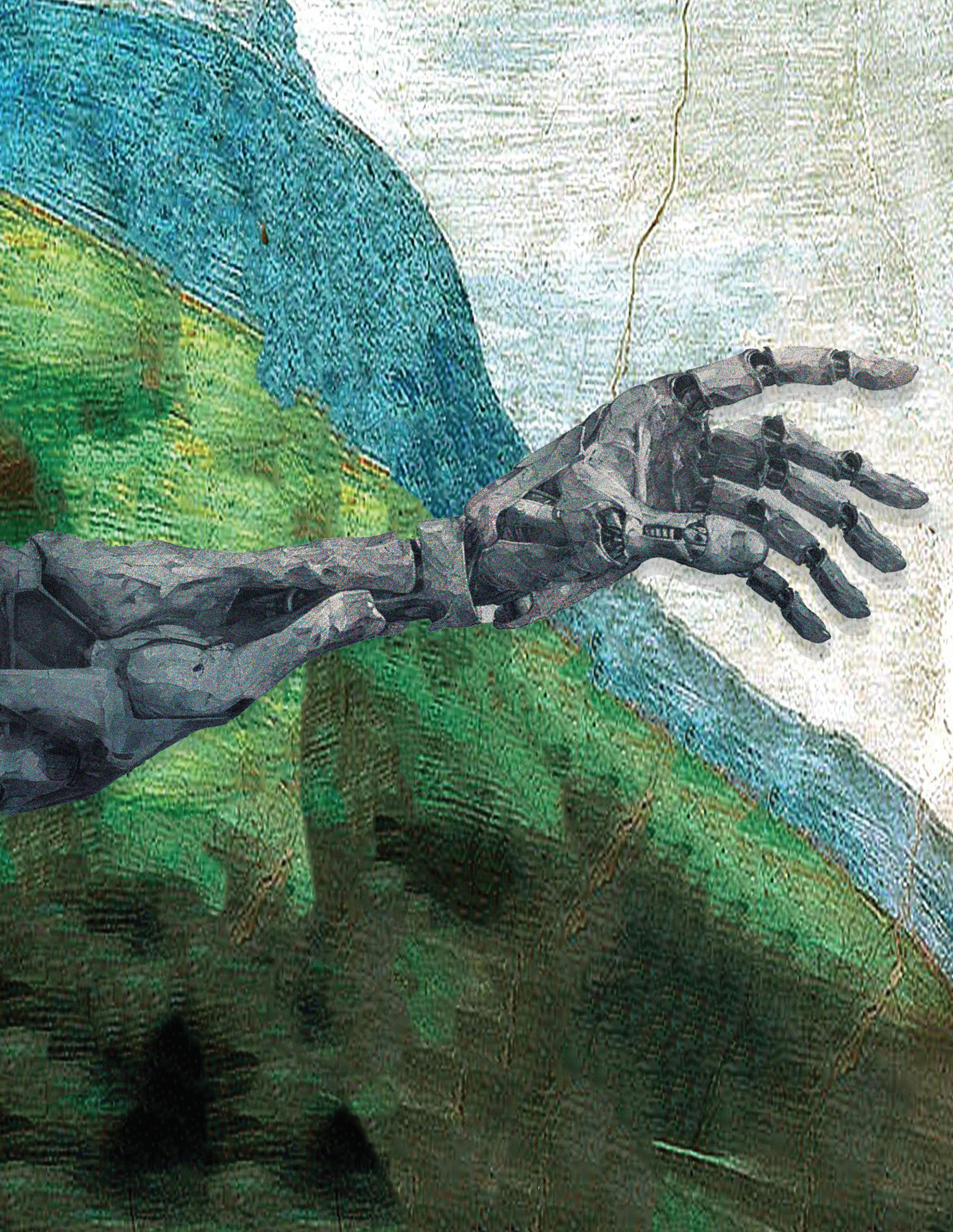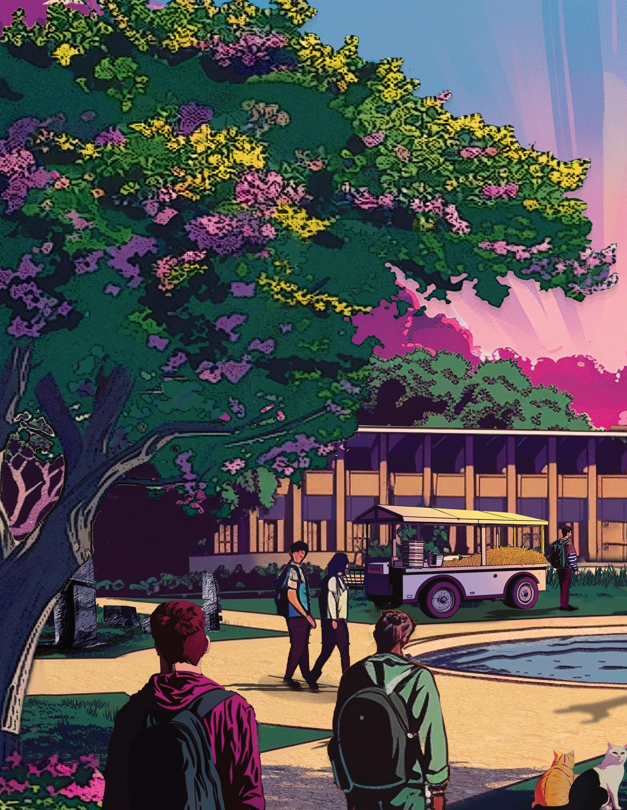 Trinity University student James Lee ’26 experimented with blending images generated from artificial intelligence (AI) with his own illustrations to create the cover.