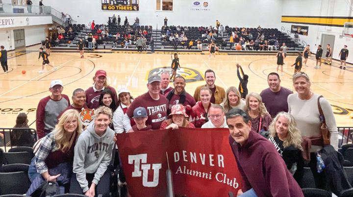 3 The Denver Alumni Club supported the Trinity men’s basketball team at Colorado College (pictured). Members also gave back to their community by unloading and wrapping gifts for the Volunteers of America Adopt a Family program.