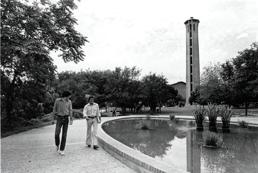 Bazaldua toured Trinity’s (much expanded) campus with Kris Howland, director of Gift and Estate Planning, stopping by Coates Library, the Dicke-Smith Building (Bazaldua was an art major), and the Storch Memorial Building (the library during his time).