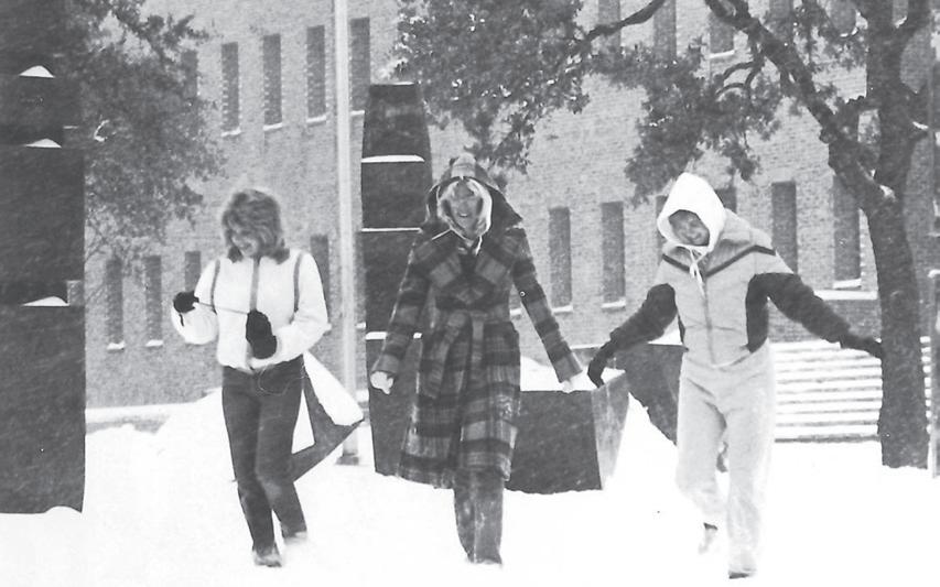 January 1985 saw San Antonio’s last big snowfall—until December 2017. The 1985 Mirage read, “In January, we had a special treat, although the rest of San Antonio might have called it a trick. Thirteen inches of snow fell and made for all sorts of amusements. Brave souls slid down the SUB’s stairs, transforming humble Refectory trays into sleds, while giant Yeti sprang up everywhere.”