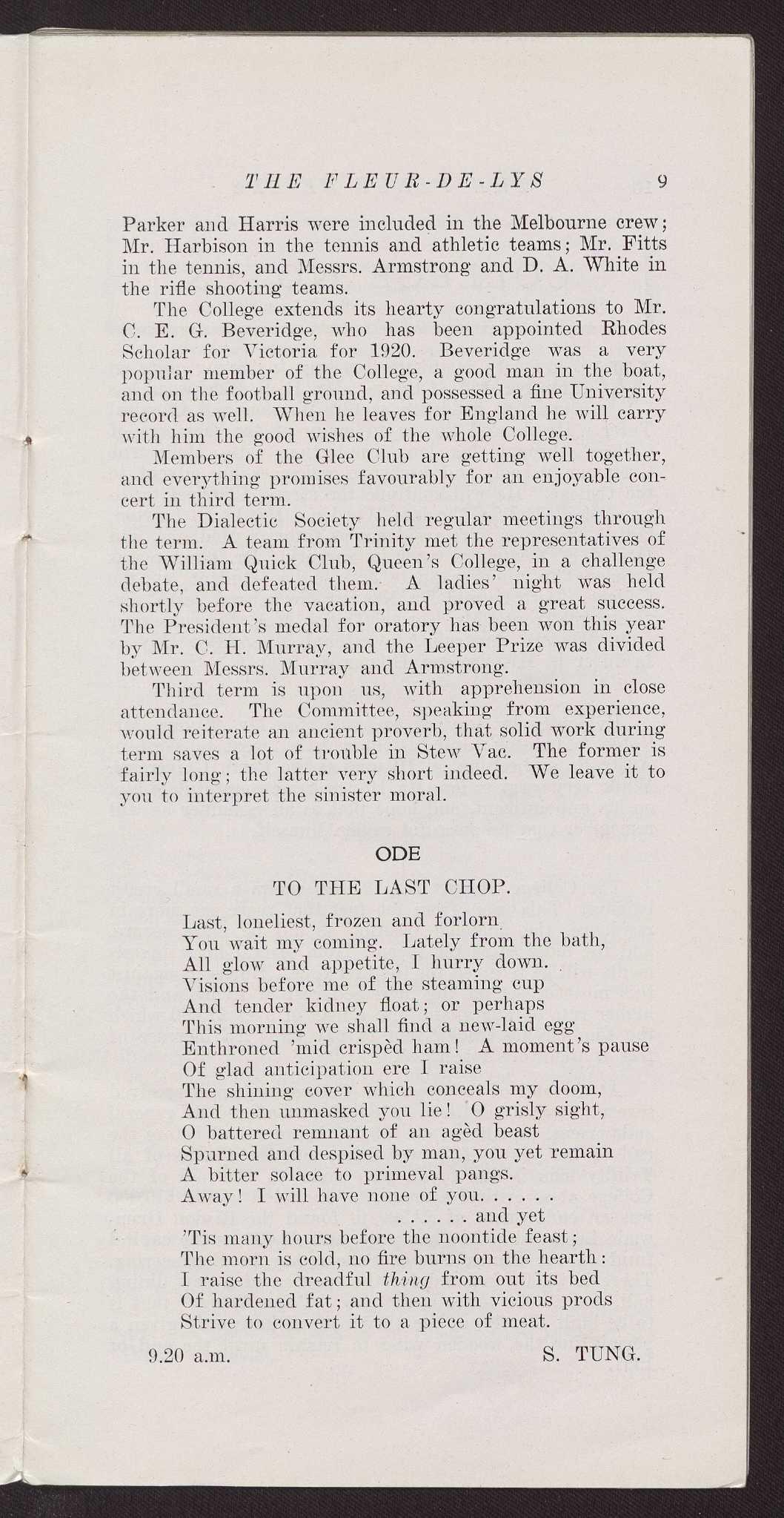 The College extends its hearty congratulations to Mr. C. E. G. Beveridge, who has been appointed Rhodes Scholar for Victoria for 1920. Beveridge was a very popular member of the College, a good man in the boat, and on the football ground, and possessed a fine University record as well. When he leaves for England he will carry with him the good wishes of the whole College.