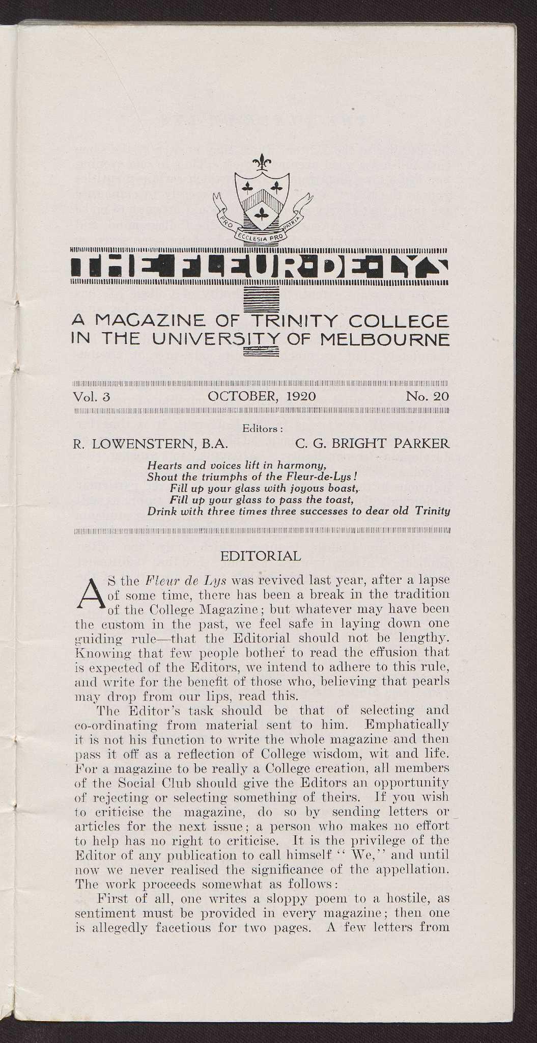 AS the Fleur de Lys was revived last year, after a lapse of some time, there has been a break in the tradition of the College Magazine ; but whatever may have been the custom in the past, we feel safe in laying down one guiding rule—that the Editorial should not be lengthy. Knowing that few people bother to read the effusion that is expected of the Editors, we intend to adhere to this rule, and write for the benefit of those who, believing that pearls may drop from our lips, read this.